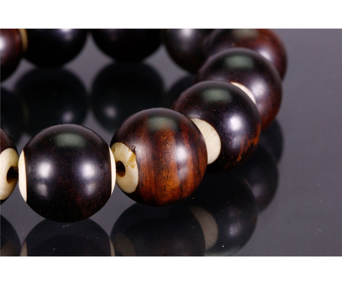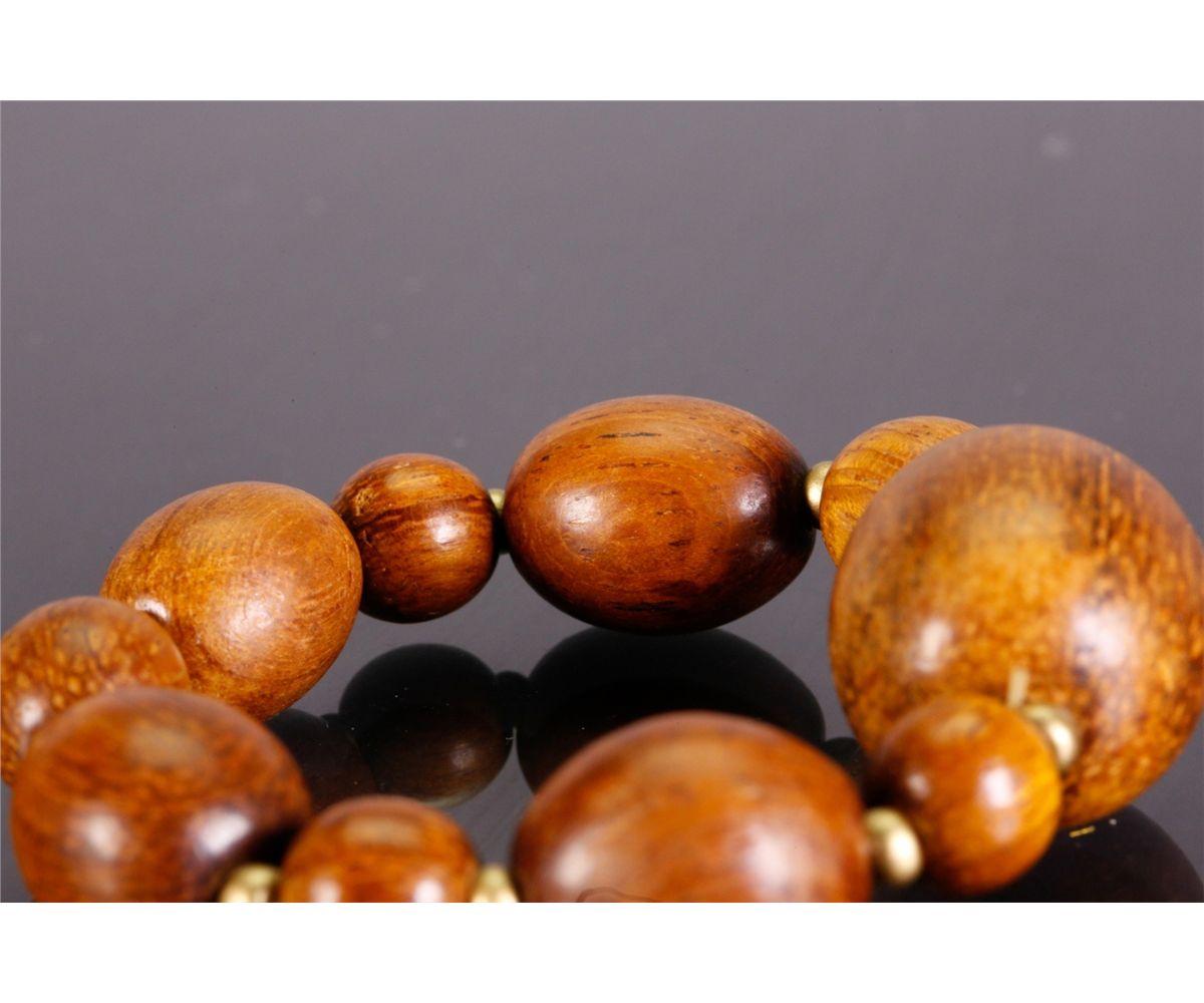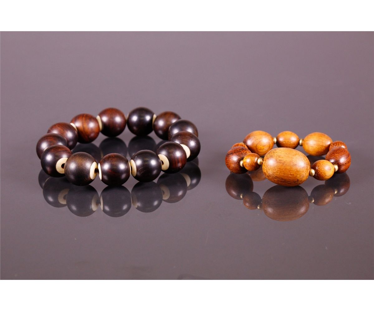 Two pieces of Chinese wood bracelets; one comprised of dark brown wood and bone beads; the other one comprised of oval brown wood beads; D: 9 cm, Inner D: 6 cm, 57 grams both