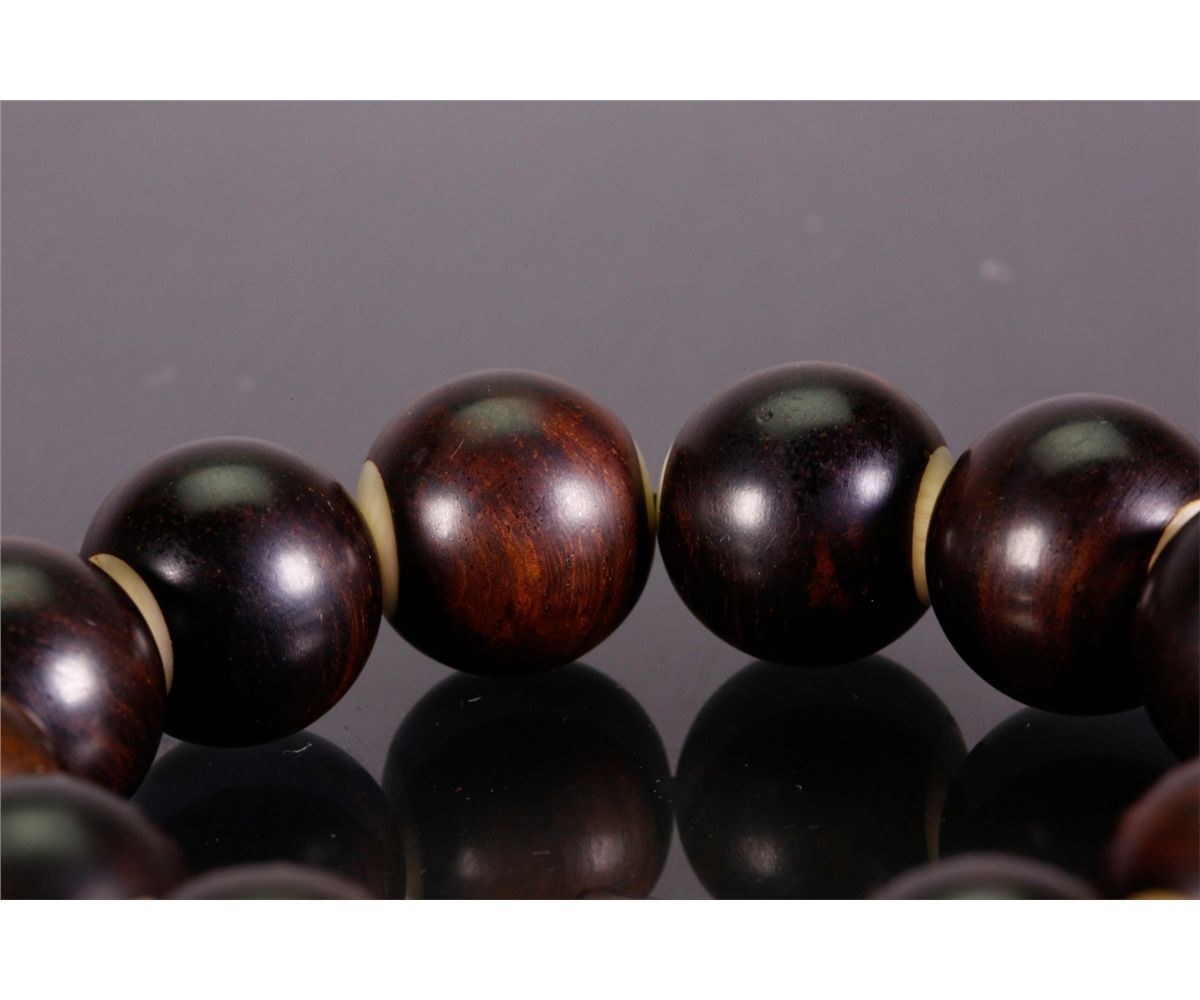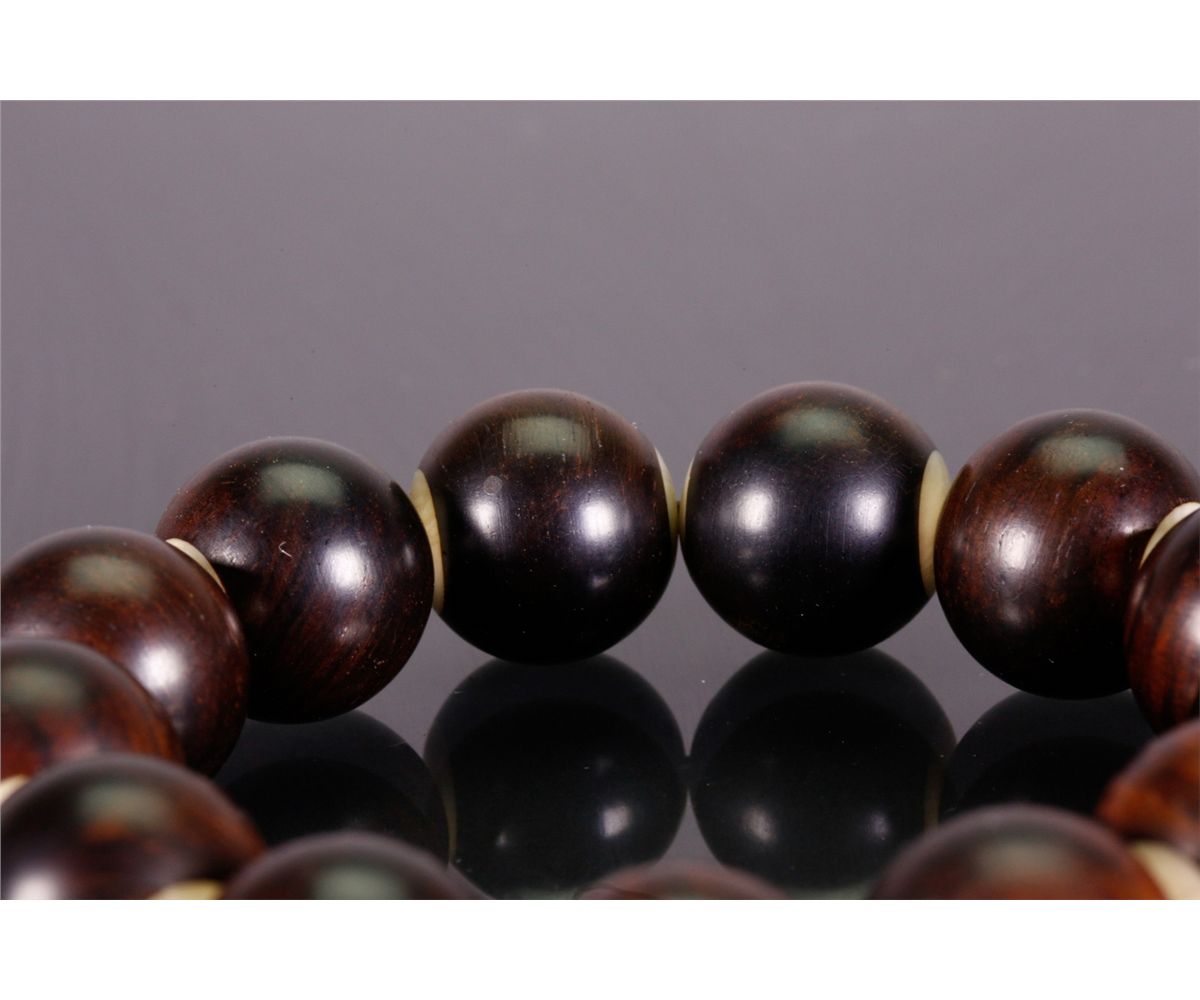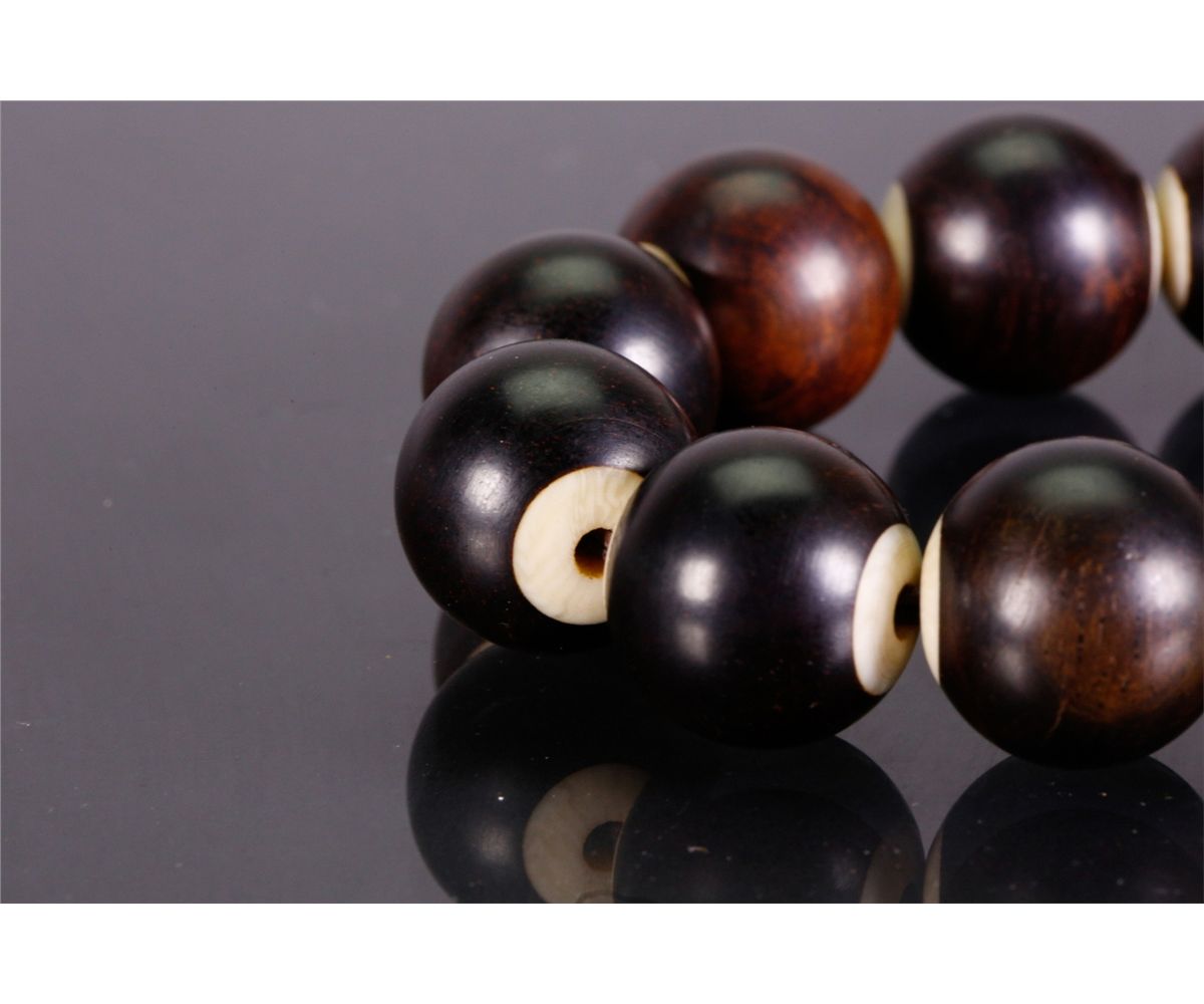 Two pieces of Chinese wood bracelets; one comprised of dark brown wood and bone beads; the other one comprised of oval brown wood beads; D: 9 cm, Inner D: 6 cm, 57 grams both