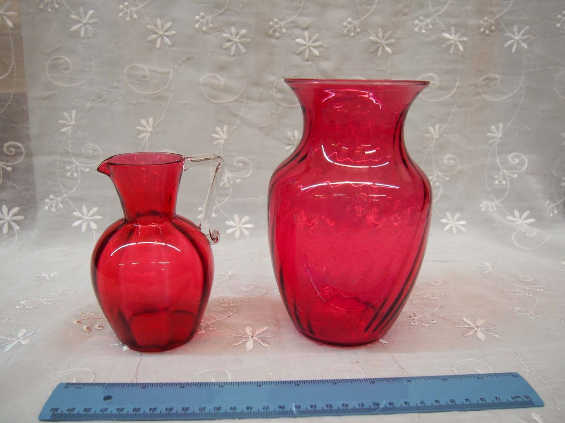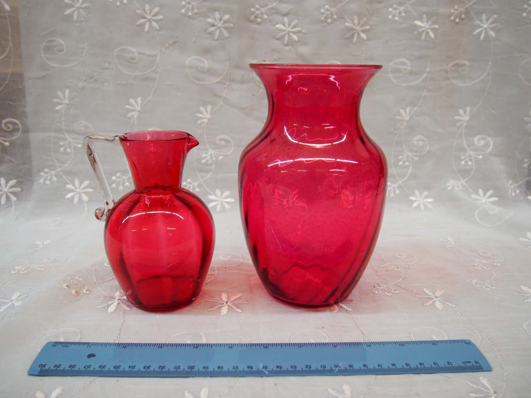2 Pieces of Cranberry Glass , Vase and Pitcher
