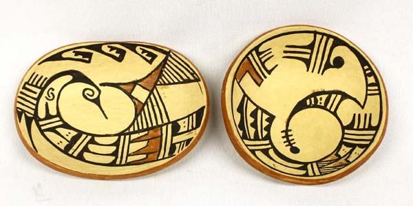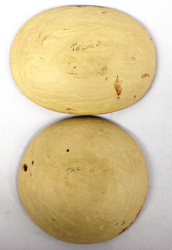 2 Pieces of Historic Native American Hopi Pottery by Treva Burton, includes 1. Hopi Pottery Shallow Bowl by Treva Burton (1929-2007), stylized rattlesnake design, measures 1''H x 4''D and is signed on the bottom, ''FYI: ''Treva Burton was born on April 8, 1929 and is the younger sister of Bessie Monongye. Little pottery is made in Oraibi (or at Third Mesa), and most of that is utility ware.'' 2. Hopi Pottery Stylized Bird Bowl or Dipper by Treva Burton (1929-2007) Corn Clan, Old Oraibi Village, Third Mesa, measures 3.5'' x 4.75'' and is signed on the bottom