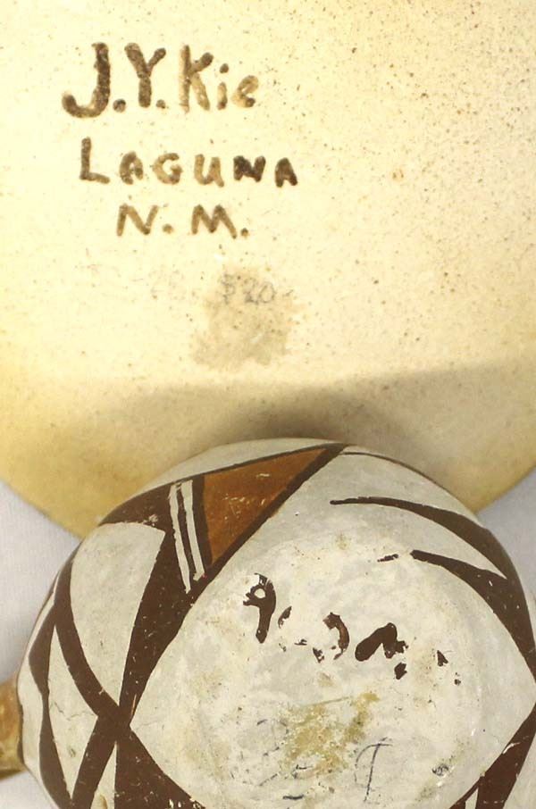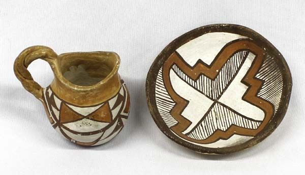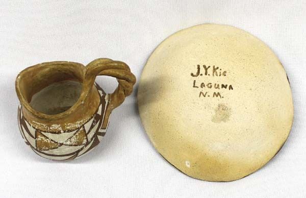2 Pieces of Historic Native American Pottery, includes: 1. Laguna Pueblo Pottery Shallow Bowl by J. Y. Kie, measures 1'' x 4.5'' and is signed on the bottom 2. Acoma Pottery Pitcher, twist handle, measures 3'' x 3'' x 2.5