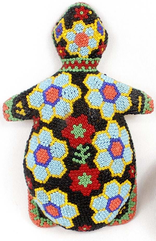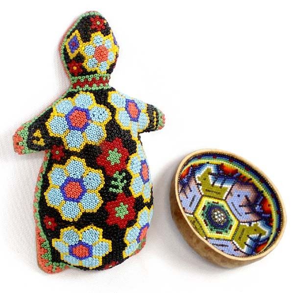 2 Pieces of Huichol Beaded Art, includes 1. Antique Vintage Turtle measuring 6''L x 1.5''H x 4''W 2. Beaded Gourd Bowl measuring 3'' x 1'' FYI: ''Huichol Indians homeland is located in secluded regions of the Sierra Madre mountains in the states of Jalisco and Nayarit. Descendants of the Aztecs, they still maintain their pre-Columbian traditions and language. They live in communities without electricity and running water, in houses with dirt floors and thatched-grass roofs. Huichol art is made by coating the bottom of a gourd, or the wooden figure of an animal, with a mixture of beeswax and pine tar. Then, one-by-one, the artist presses into place hundreds of brightly-colored glass beads. The creation of these works of art require a great deal of inspiration, patience and concentration, all characteristics of the Huichol Indian approach to life.''