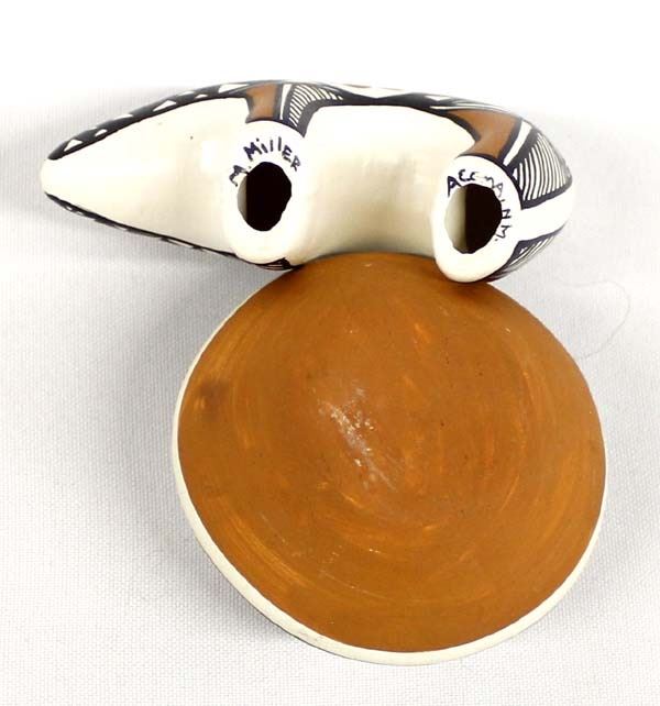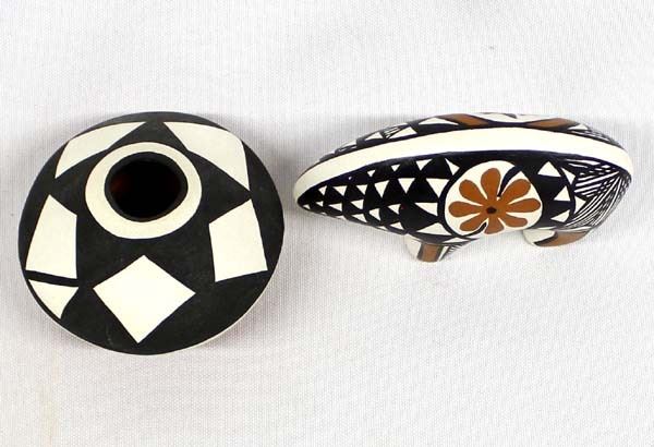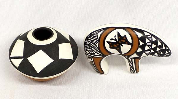 2 Pieces of Native American Acoma Pottery, includes 1. Hand Painted Ceramic Pottery Bear by M. Miller, measures 3.5'' x 2 3/8'' 2. Bowl, unsigned and measures 2.75'' x 2''