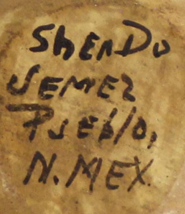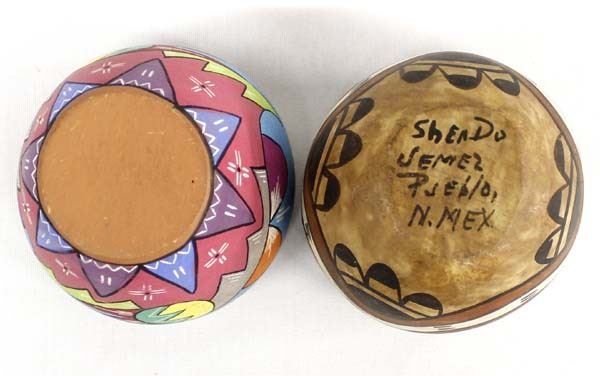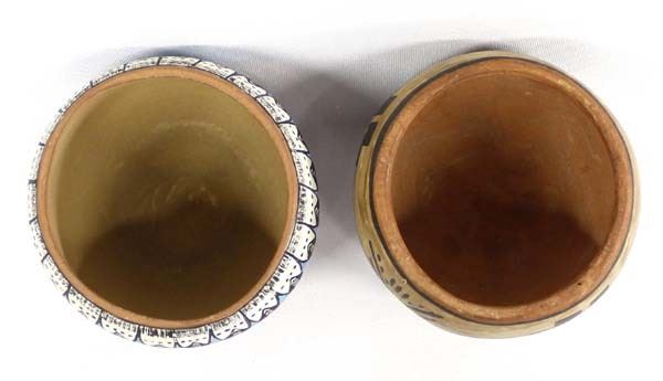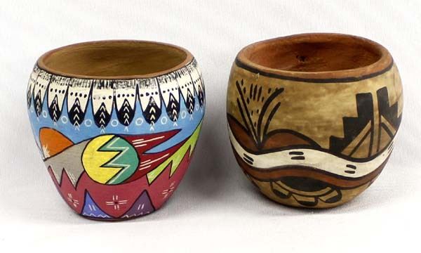 2 Pieces of Native American Jemez Pottery, beautiful poster paint jar and unusual jar by Helen Shendo, largest measures 3'' x 3''