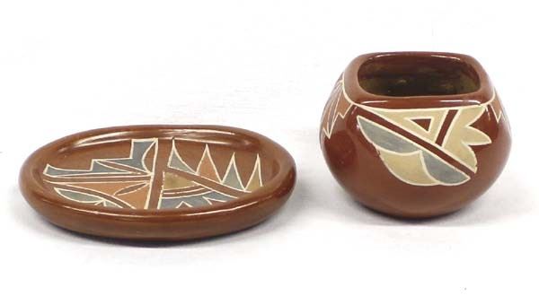 2 Pieces of Historic Native American Santa Clara Pottery, includes 1. Santa Clara Redware Pottery Bowl, square rim, measures 3.25'' x 4'', nice thick walled bowl and is highly burnished, unsigned   2. Pottery Tray/Shallow Bowl, measures 6.25''L x 4.75''W x 1''H, very nice thick pottery, handwritten on the bottom reads ''Santa Clara Indian'' ''Arizona'' (Santa Clara Pueblo is in New Mexico), there is also more writing, however I cannot decipher it