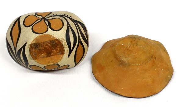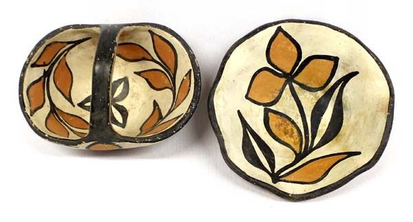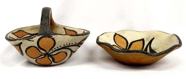 2 Pieces of Vintage Native American Santo Domingo Pottery, largest measures 5'' x 3.5'' x 3.5'', includes 1. Pottery Basket 2. Fluted Rimmed Bowl, both have traditional flower motif