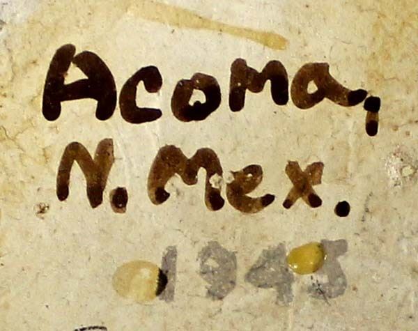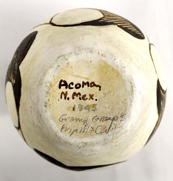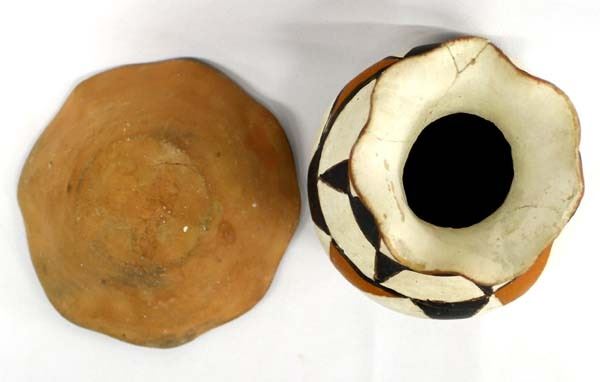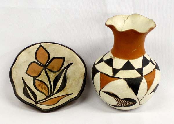 2 Pieces of Vintage Native American Pottery, includes: 1. Acoma Pottery Vase, measures 5.75''H x 4.5'', bottom is marked ''Acoma, N. Mex. 1943 Gram & Gramps Trip to Calif.'', fluted rim, has been glued back together 2. Santo Domingo Pottery Shallow Bowl, ruffled rim, measures 5.5'' x 1.5''