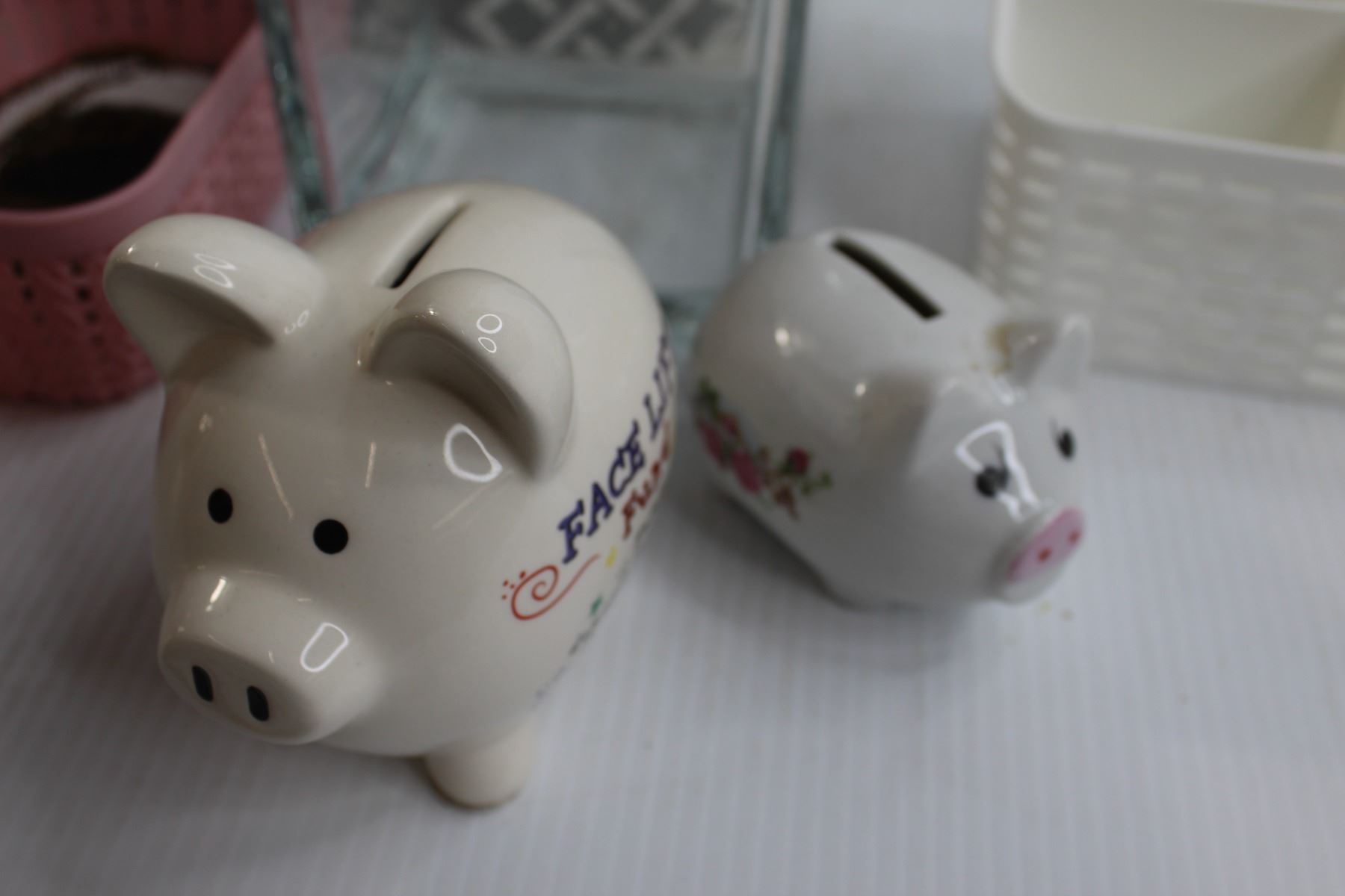 *(2) Piggy Banks, Hamper, Mini Garbage Bin, Misc.