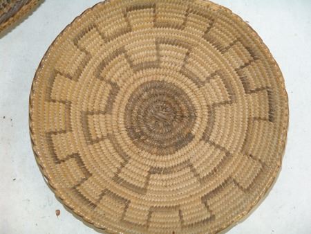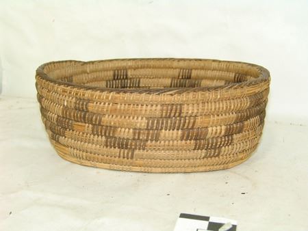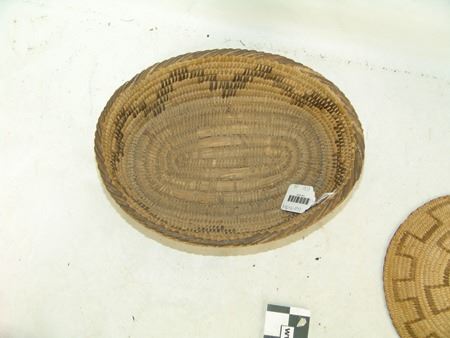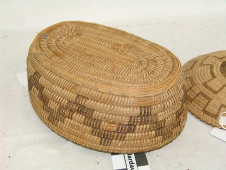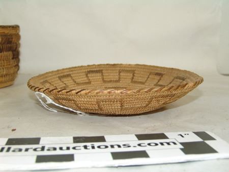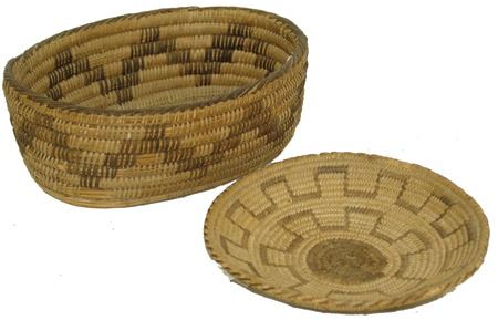 Early/Mid 1900s, Pair of classic old examples including a small plate with key-type design and an oval bowl done in a spaced stitch with geometric forms. Good condition, both have some stitch loss. Larger 11" x 8" x 4"
