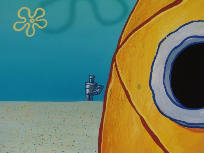 This original hand-painted background from the Nickelodeon TV show SpongeBob Squarepants. The story takes place under the deep blue sea in Bikini Bottom, where SpongeBob resides. SpongeBob, who is a yellow, porous sponge, is your typical happy-go-lucky character, as he is always cheerful and enjoys making people laugh. Patrick Star, SpongeBob's neighbor who is a starfish, is your average children's show idiot, as he boasts knowing nothing and is often getting himself into ridiculous situations. Between the homes of these two lies the home of the miserable Squidward, a squid, who is known for being grouchy and playing tricks on SpongeBob and Patrick. Both SpongeBob and Squidward work at the Krusty Krab, a fast food business run by the greedy money-loving Mr. Krabs, a crab, the arch rival of the evil, possibly misunderstood, Plankton. Another neighbor, Sandy Cheeks, an athletic squirrel who normally wears an astronaut's space suit, was introduced in "Tea at the Treedome." She spends most of her time inventing and experimenting. Original Production Background Overall Size of Backgrounds: 10 1/2" x 13 7/8" Very good condition; it has been storedOriginal Production Backgrounds are used in the making of the final version of animated productions. The background establishes the location and the overall good mood of the scene. Typically, a background layout artist creates a drawing to establish the content of the scene, placement of characters, perspective and camera angle. Based on this drawing, the background artist creates a preliminary painting to confirm all of the scenes details, then the final production background which is used in the filming of the scene. When these backgrounds are individually photographed behind the progression of production cels, and projected at a rapid succession, the images in the foreground appear to move, creating an animated scene. The background is ready to be matted and framed. It is a colored background with the animator's notations at the bottom. One of the backgrounds has a minor fold to the corner.