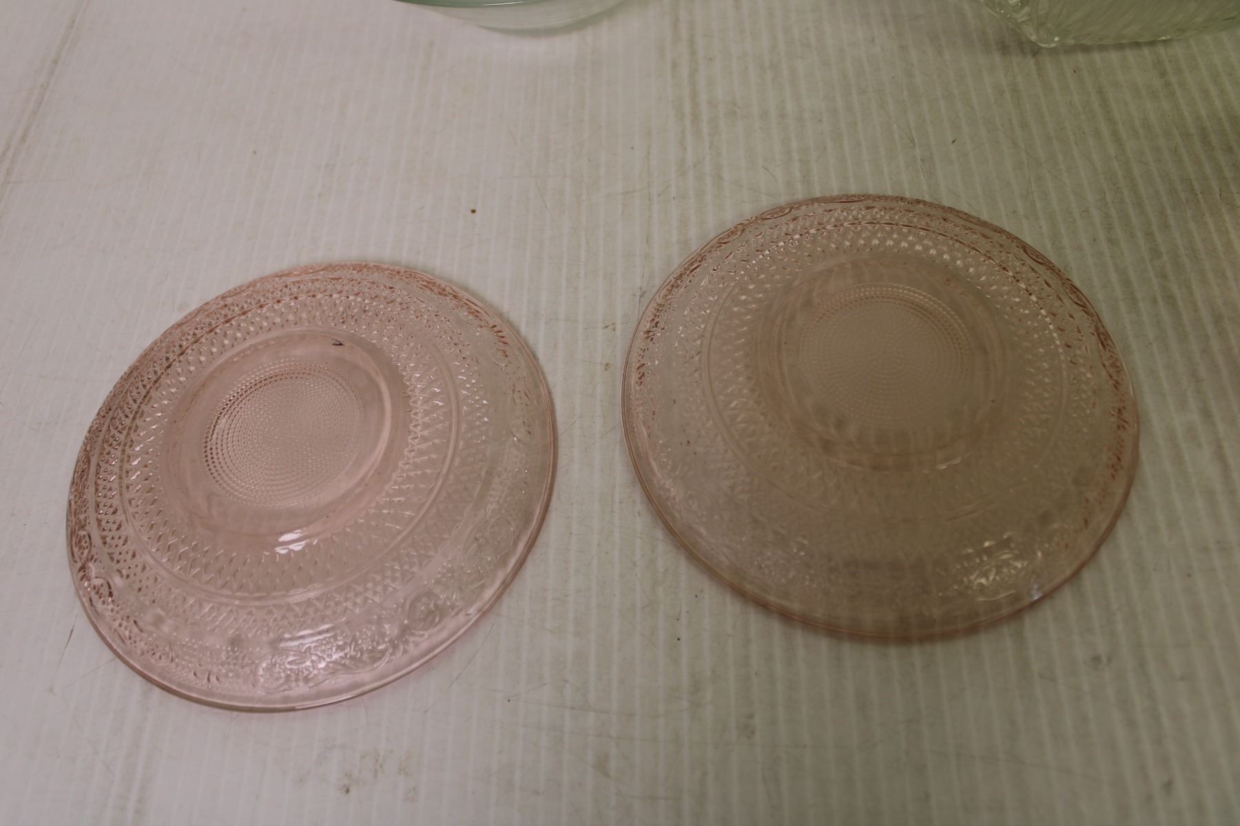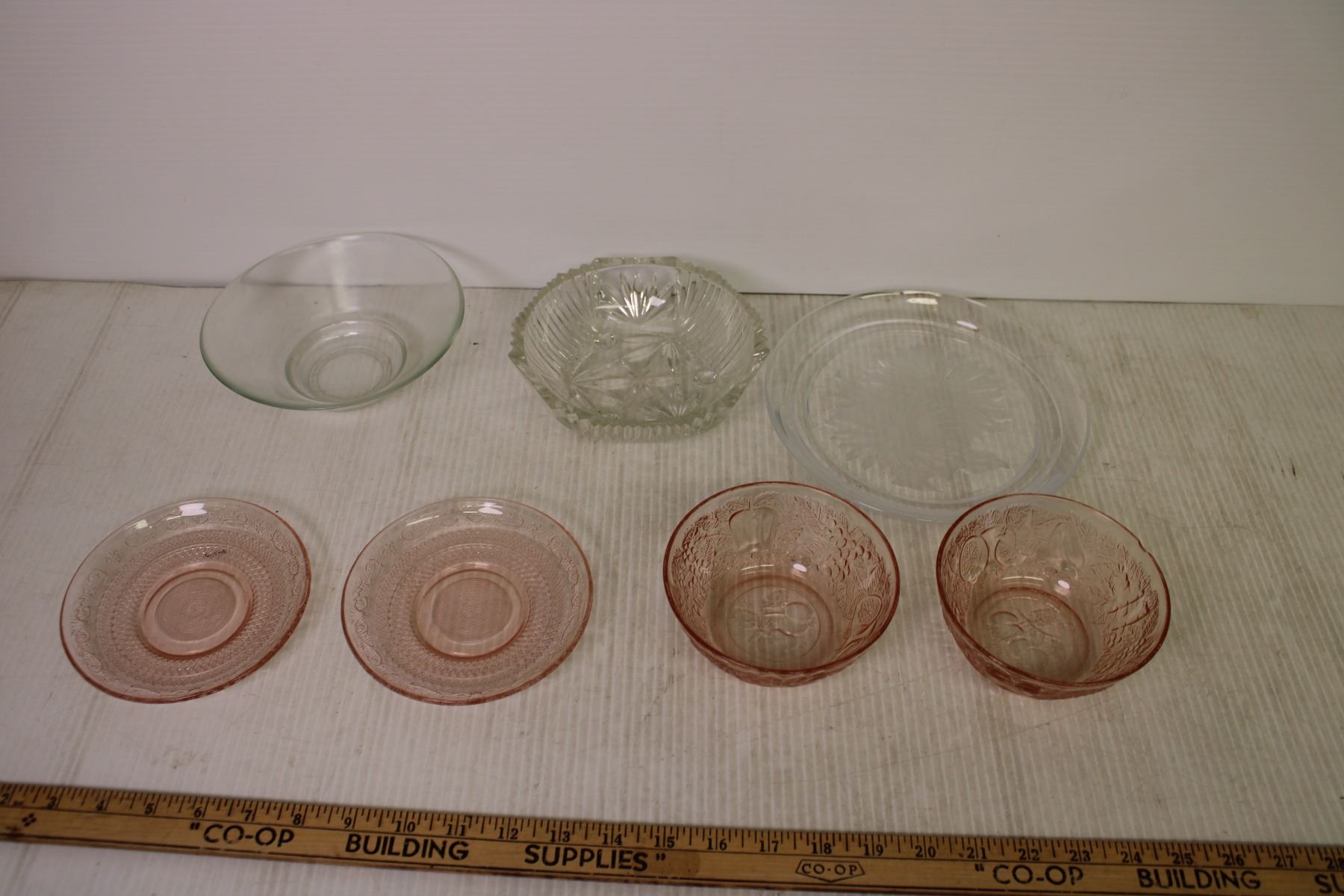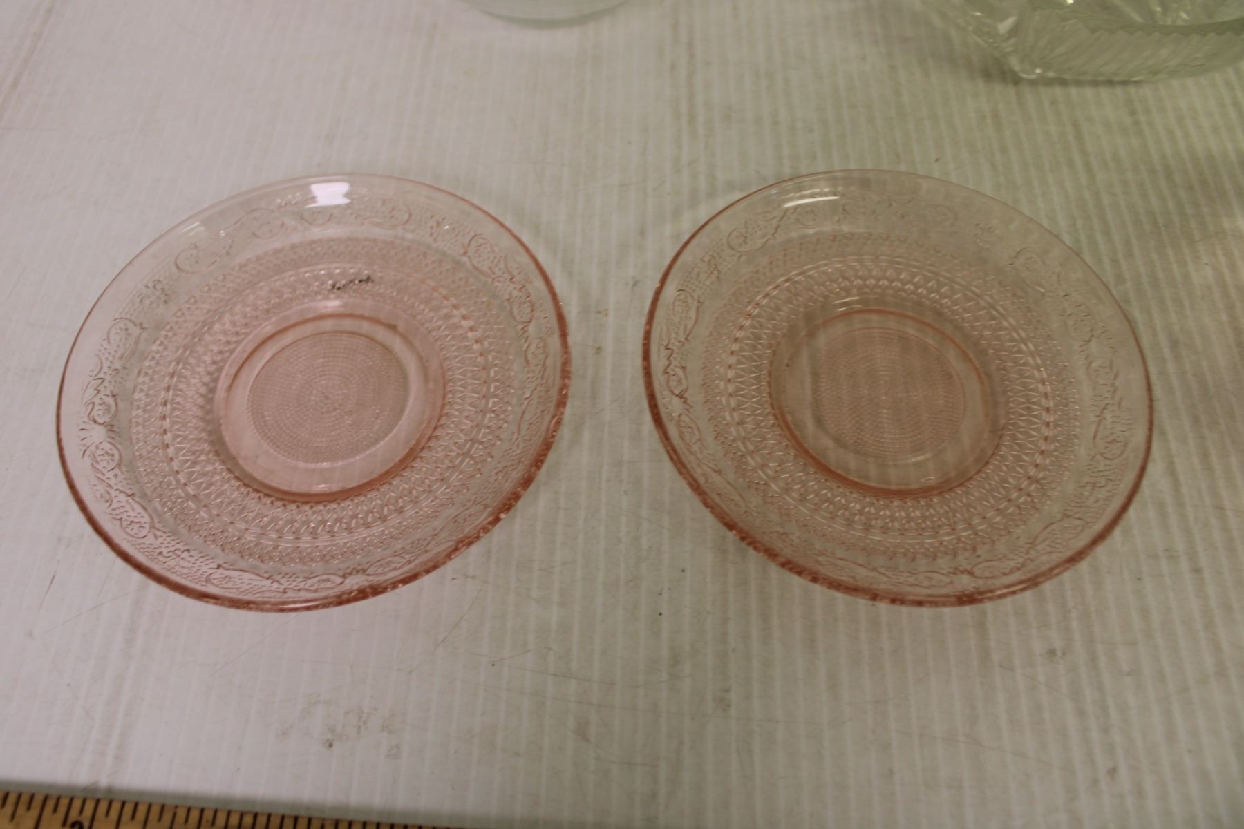2-Pink Depression Glass Saucers + Assorted Glassware