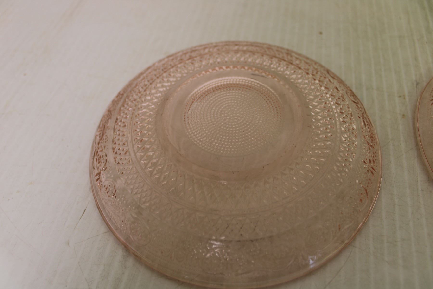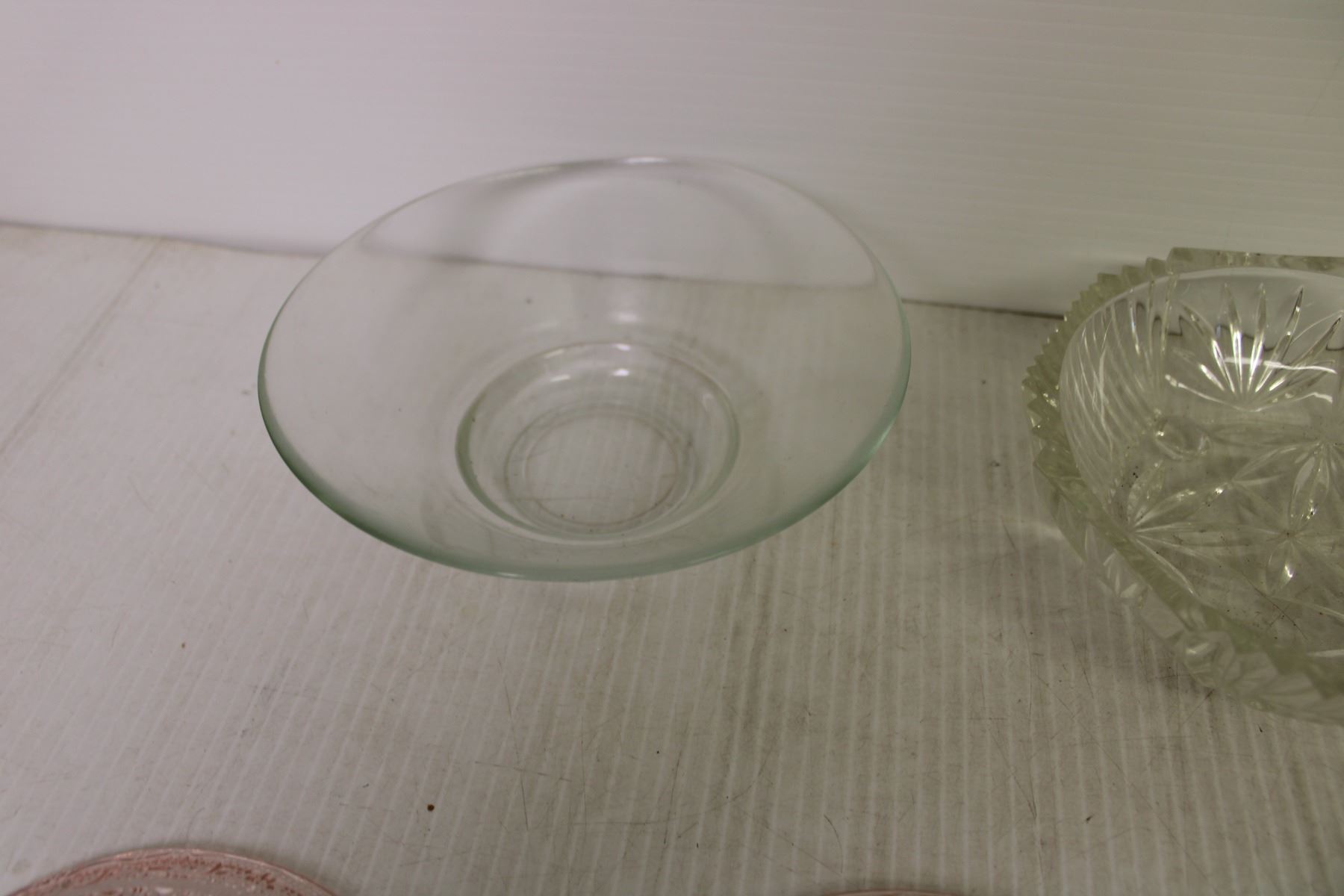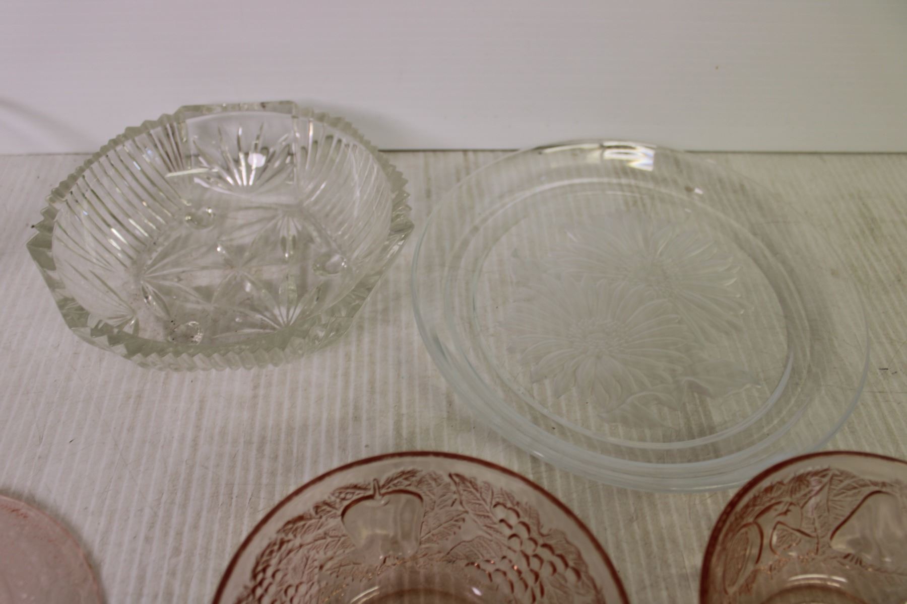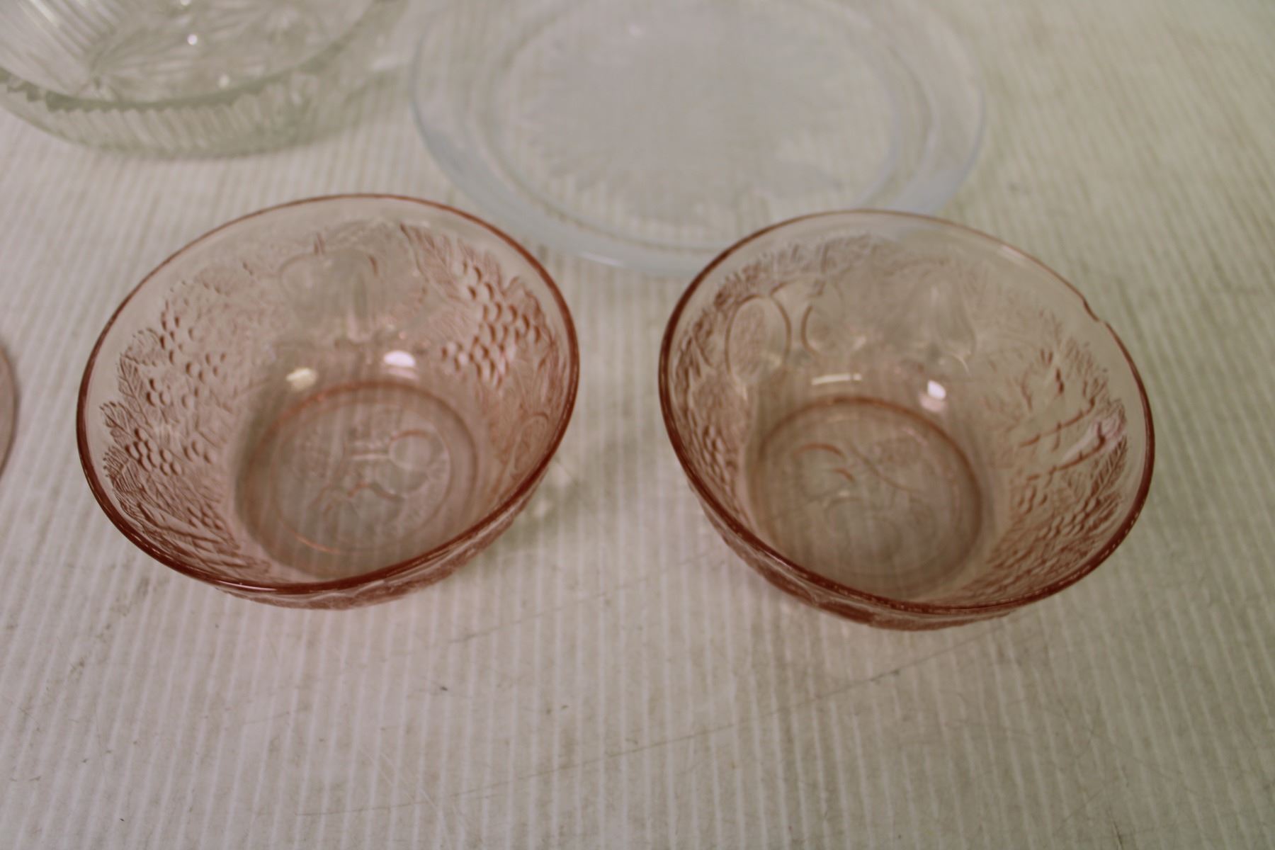 2-Pink Depression Glass Saucers + Assorted Glassware