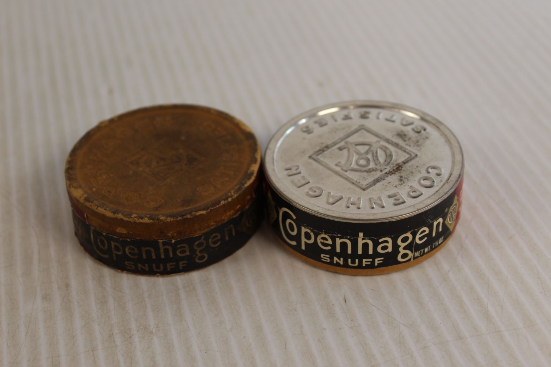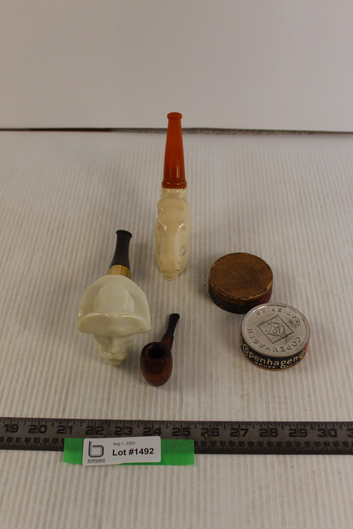 (2) Pipe Decanters, Missouri Corn Cob Pipe, (2) Copenhagen Snuff Tins