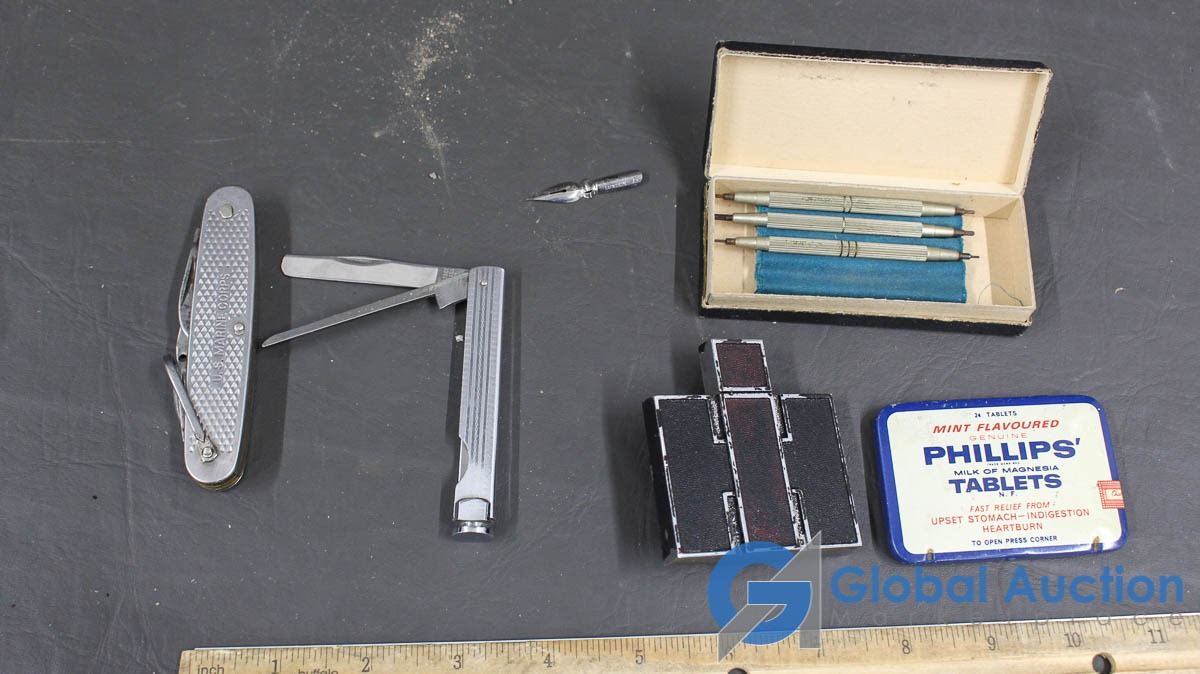2 Pocket Knives, Phillis' Tablets Tin etc.