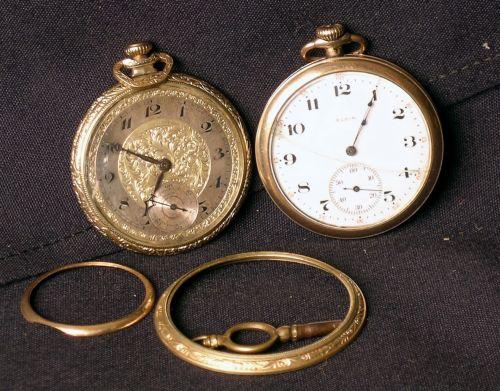 2 Pocket Watches, Elgin open case, Gruen open case Elgin is a size 12, 15 jewel, 1915 gold filled case and the Gruen is a size 18 (swiss size) 17 jewel, gold filled case and 2 extra bezels and 1 pocket watch wind-up key...