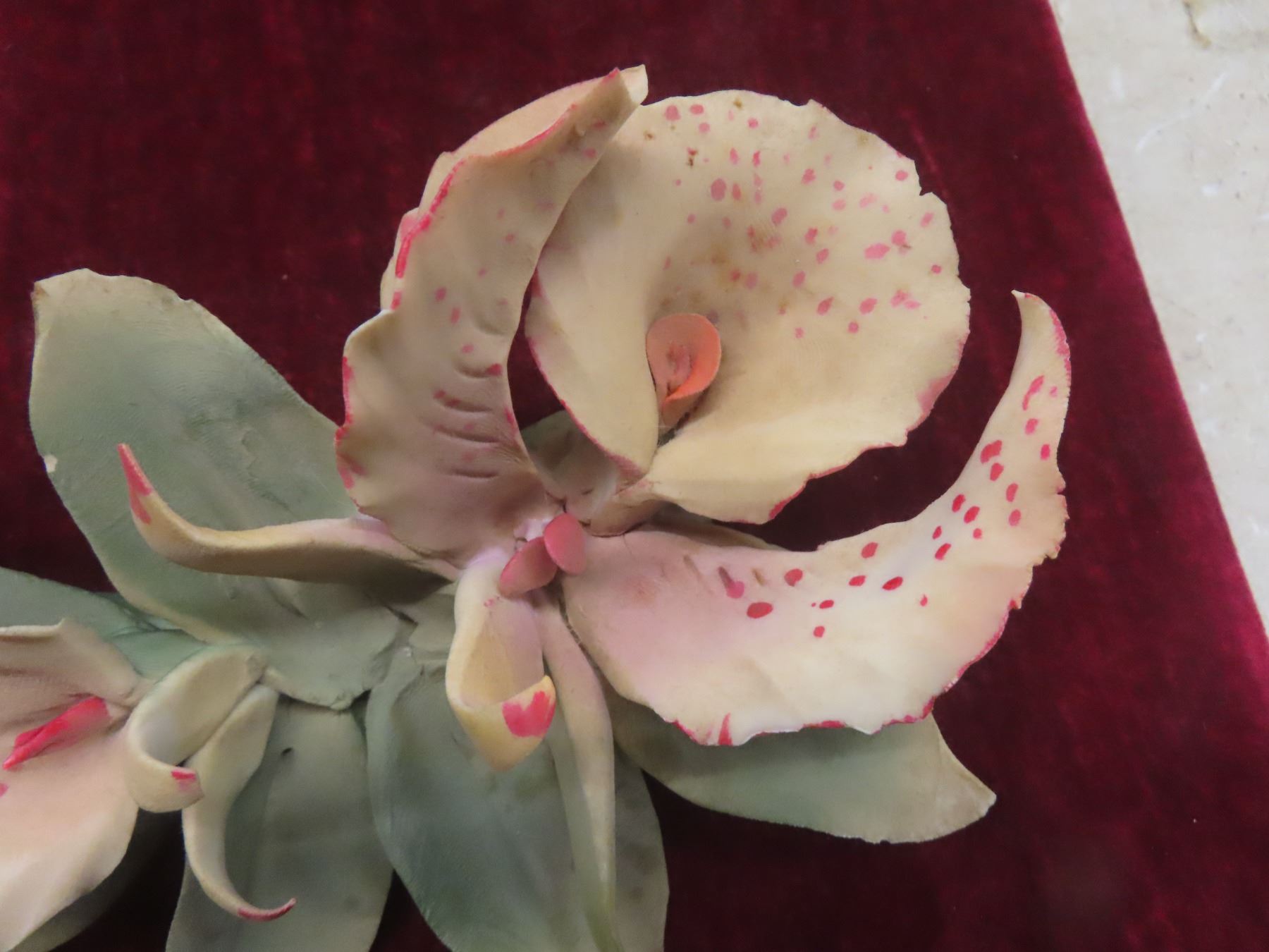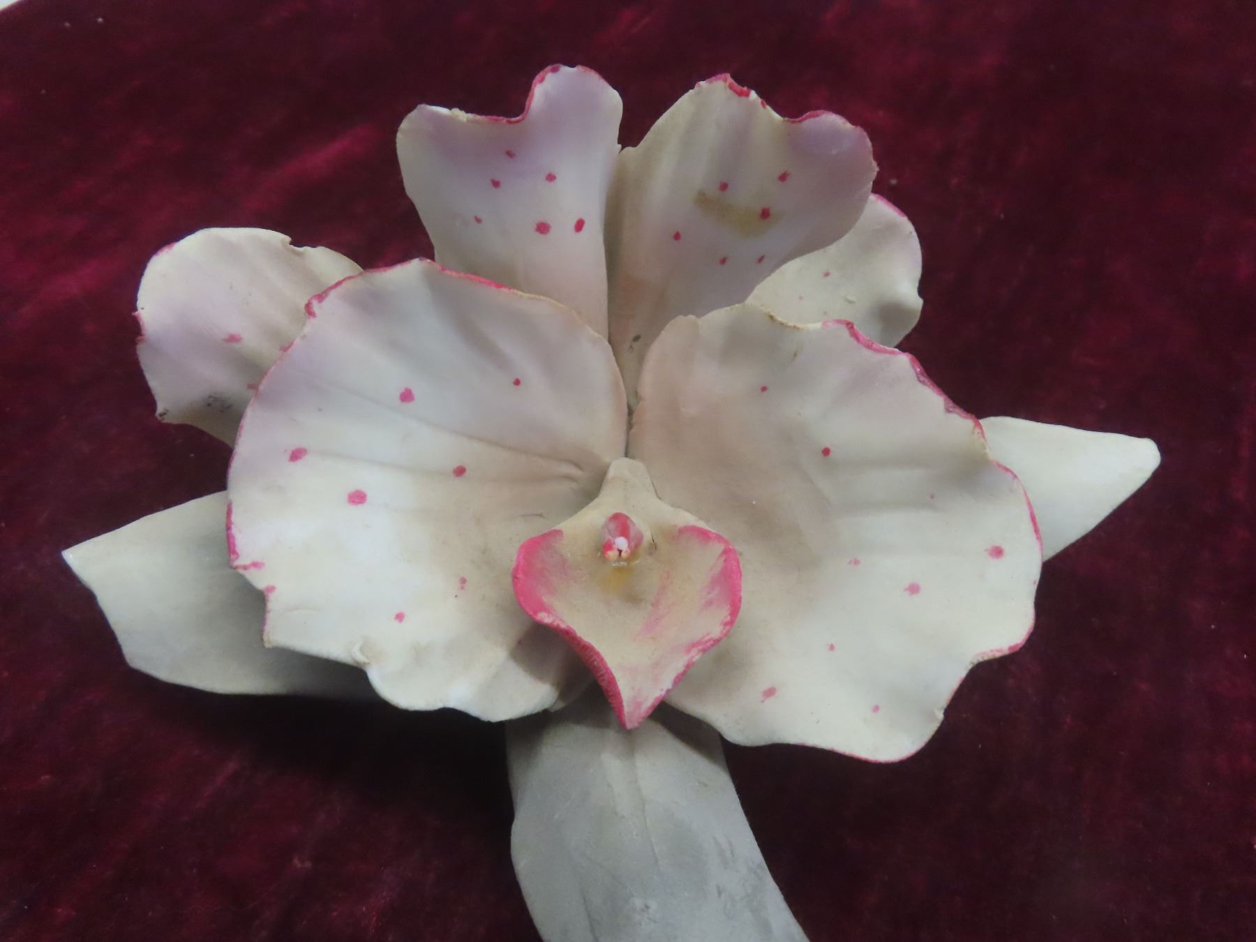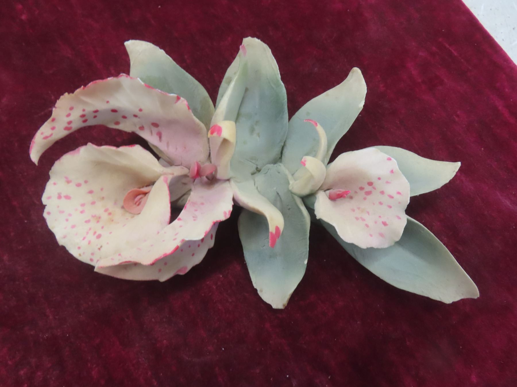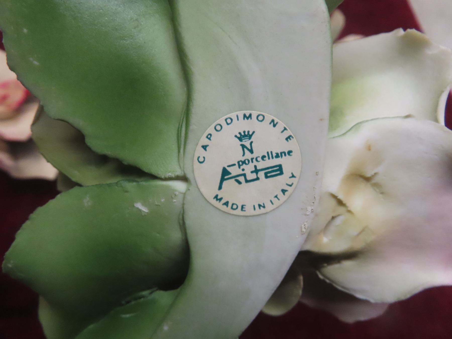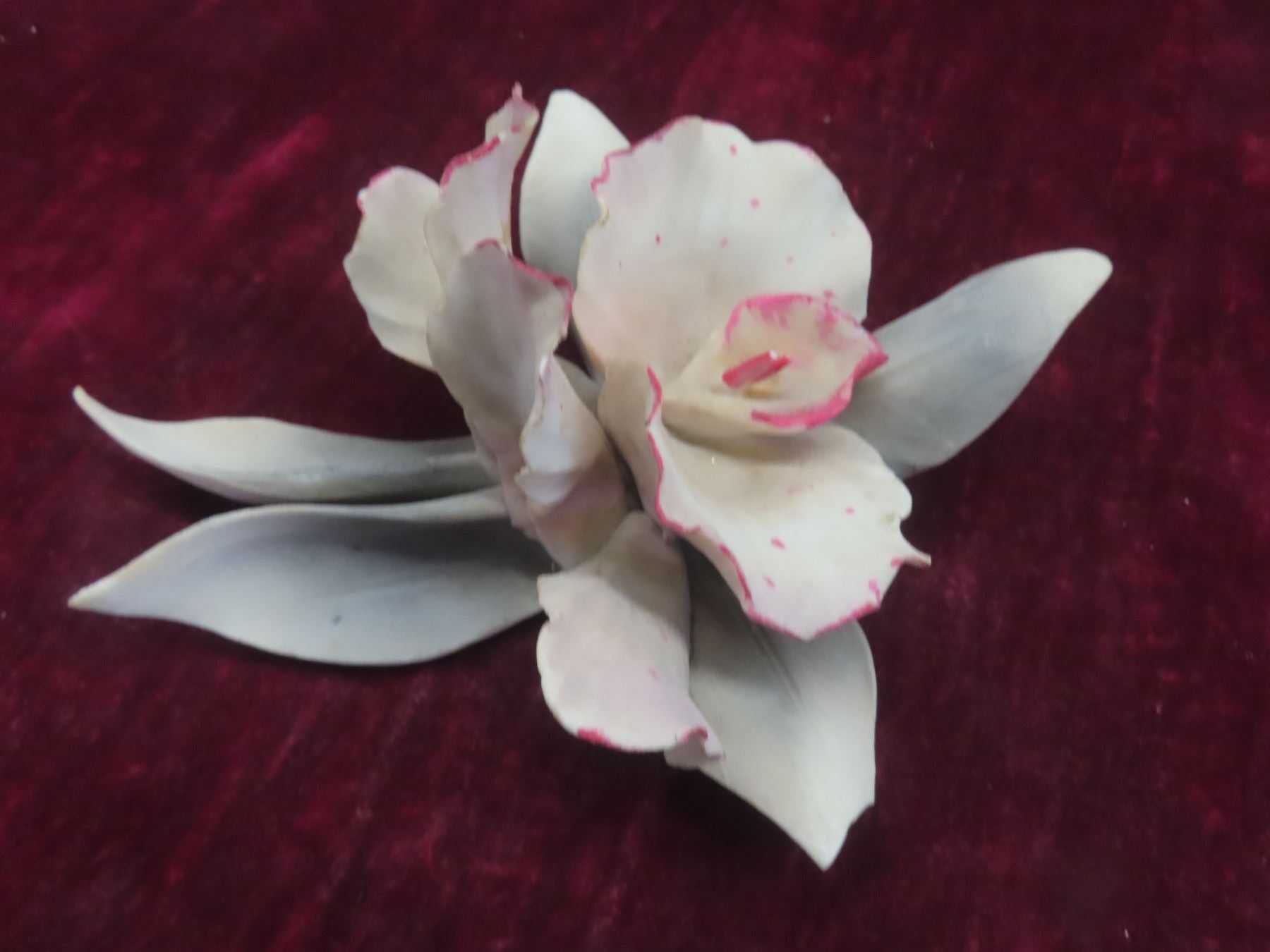 2 Porcelain Figurines (19" Tall, One Damaged), Vase, and 4 Ceramic Orchids by Capodimonte (One Damaged Piece)