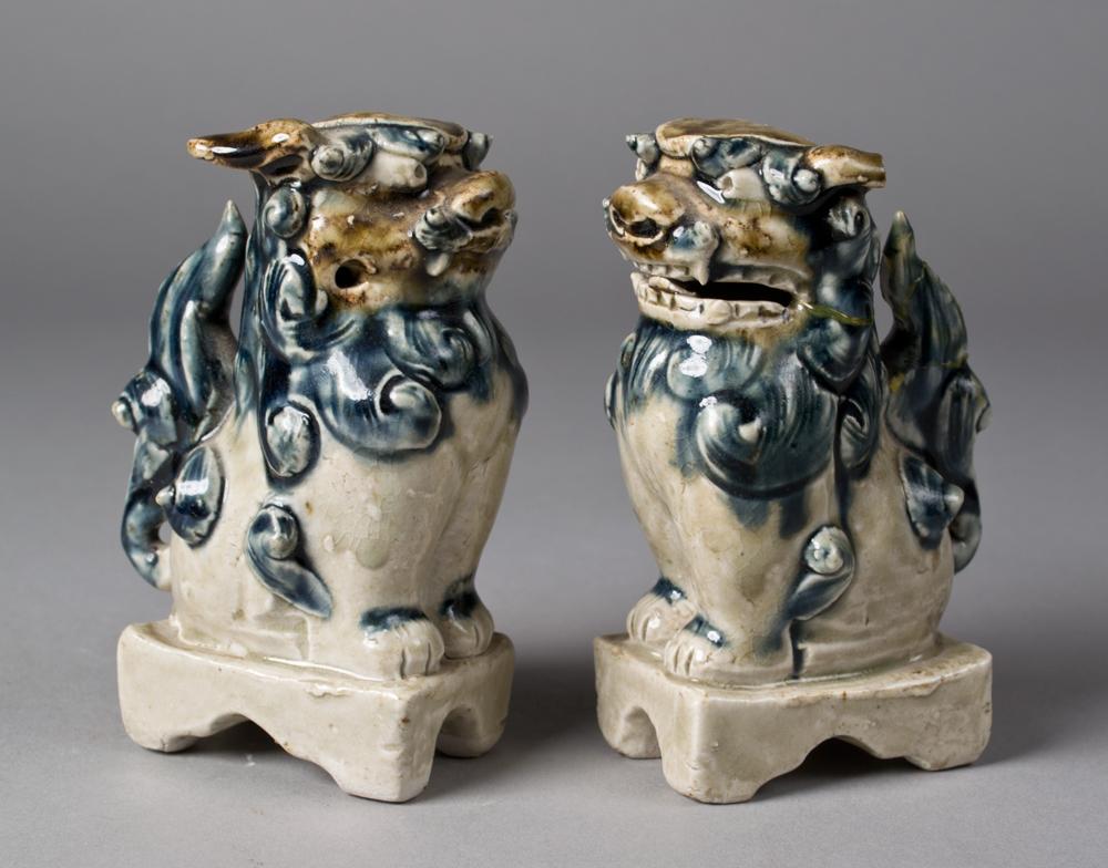 High density pottery hand made probably Japanese in teal blue and browns. Condition-both very good with exception of one which has left ear tip missing from a break.