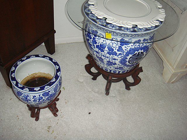 2 Oriental Blue and White Porcelain Jardineers on Tweekwood Stands.