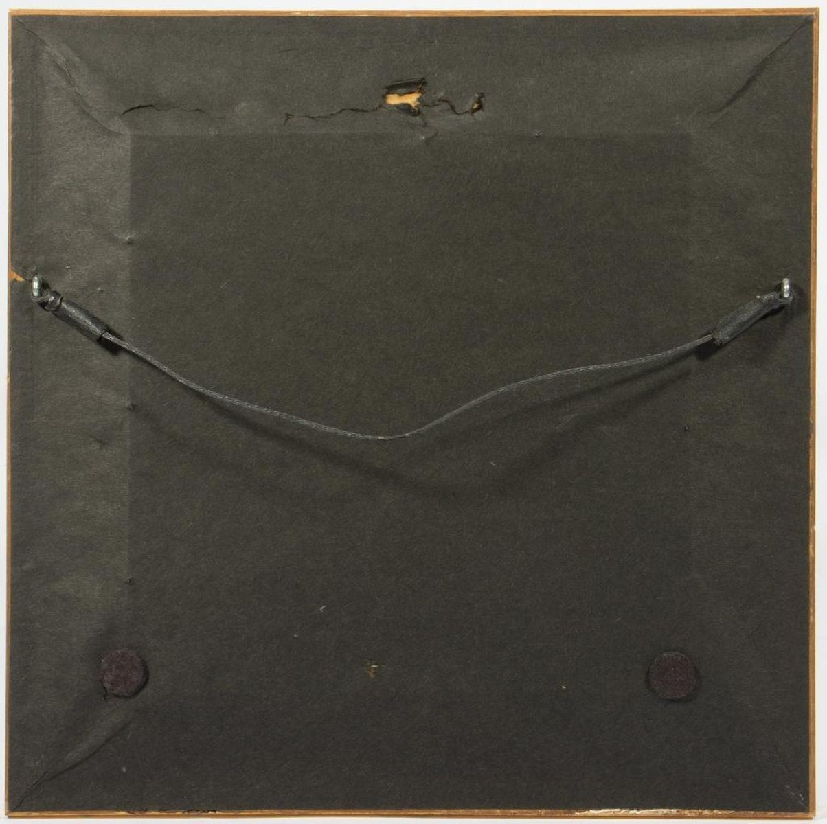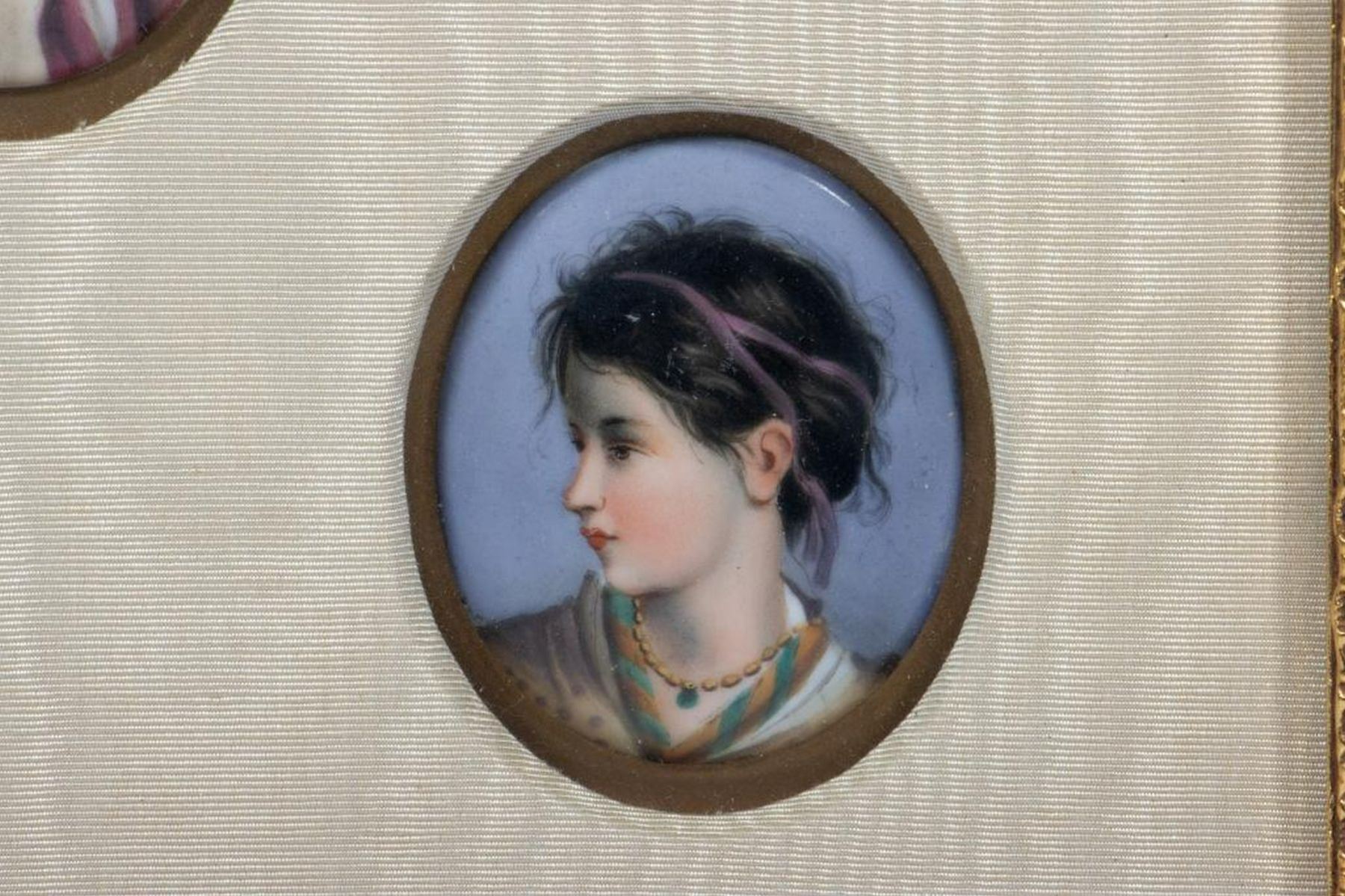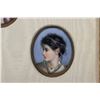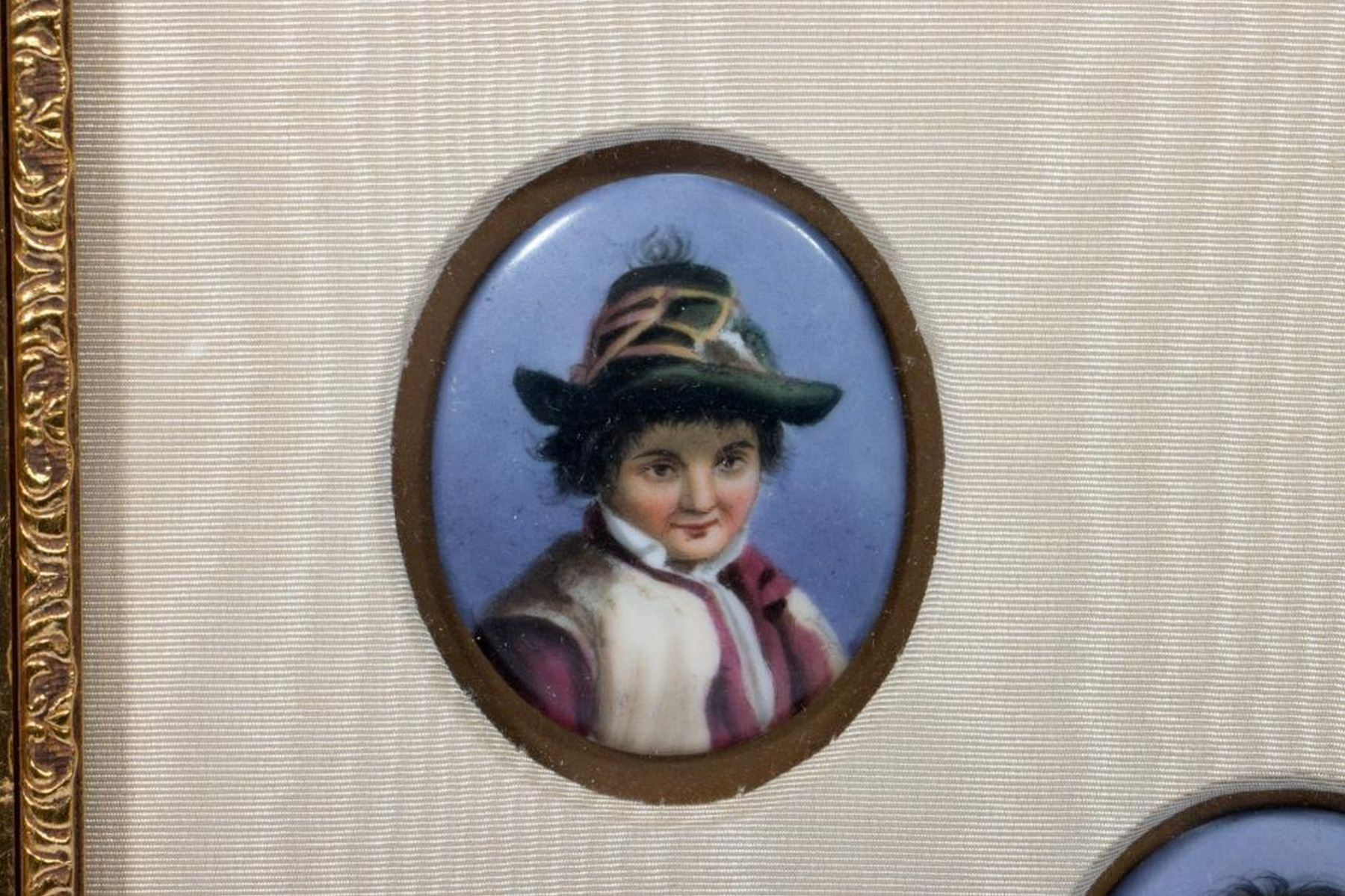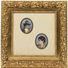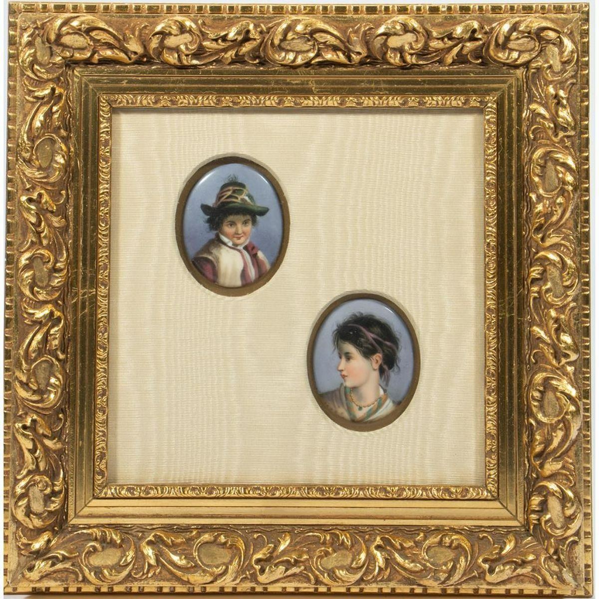 Depicting a boy in a green hat, and a girl with a purple ribbon in her hair. Each miniature is approximately 2 3/8in; the frame 11 1/4in. x 11 1/4in.