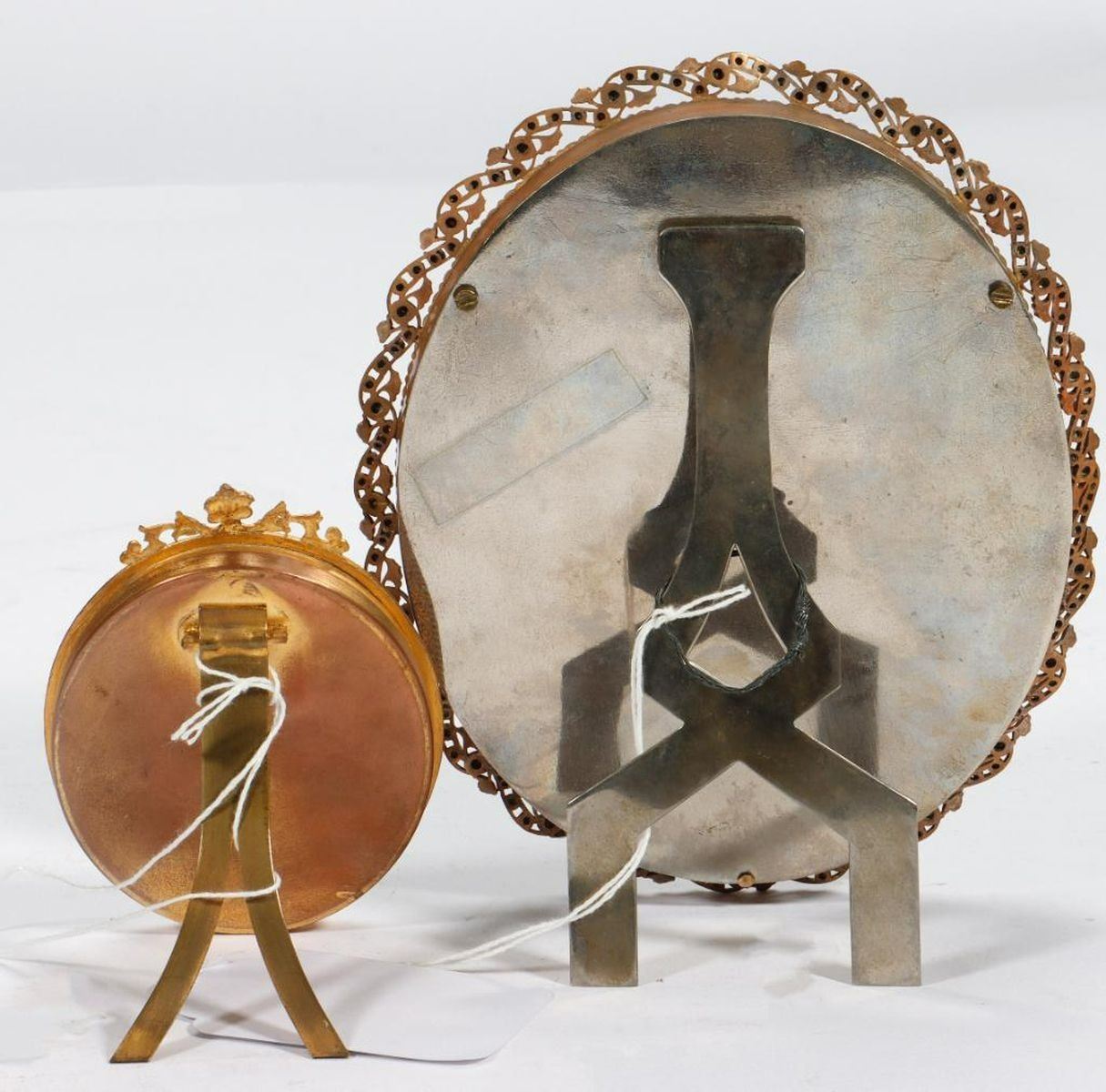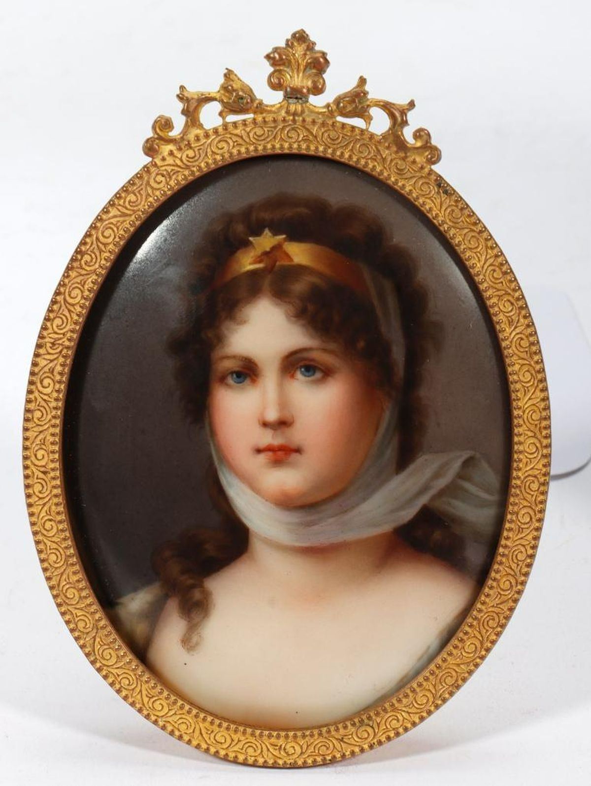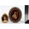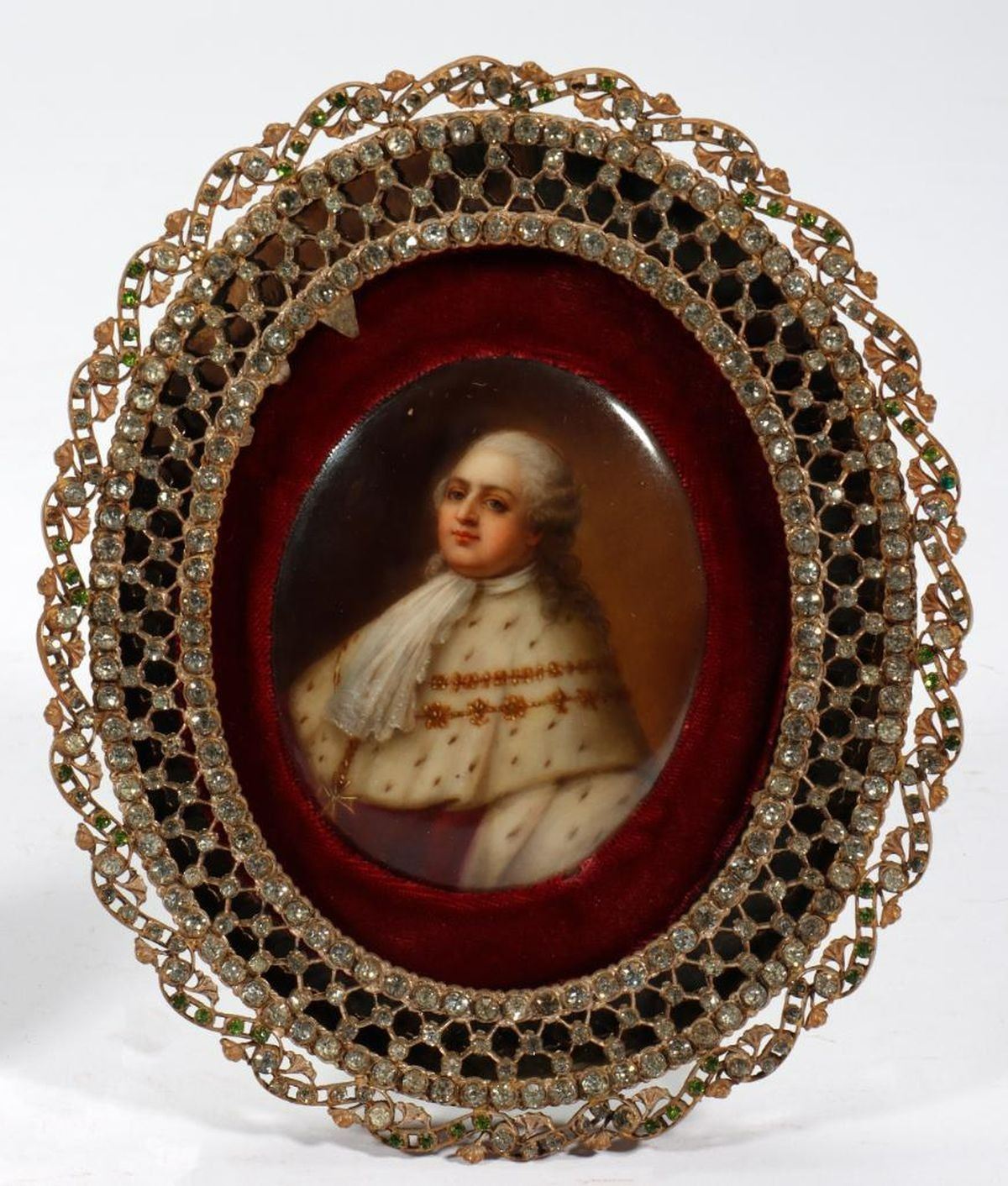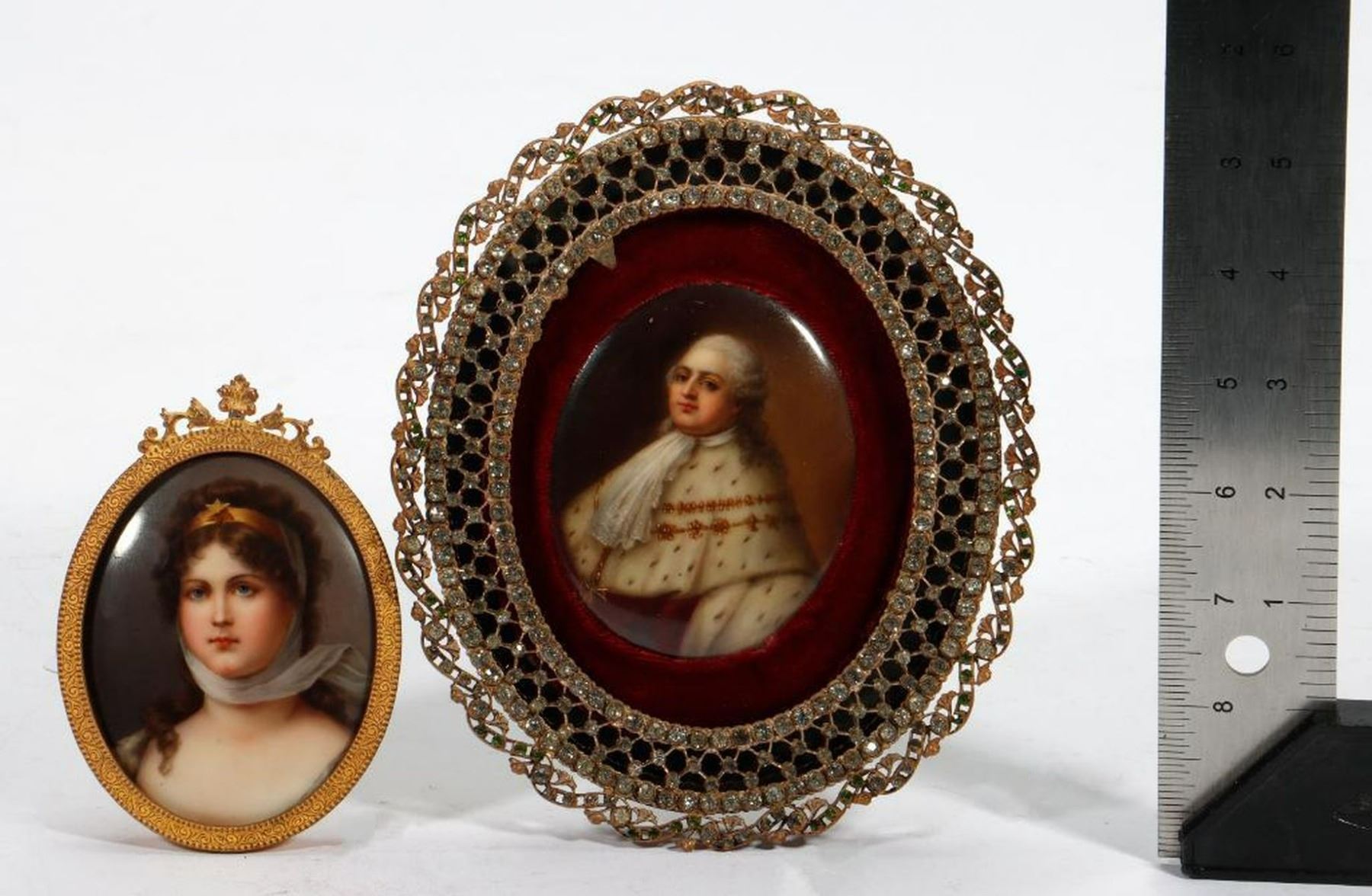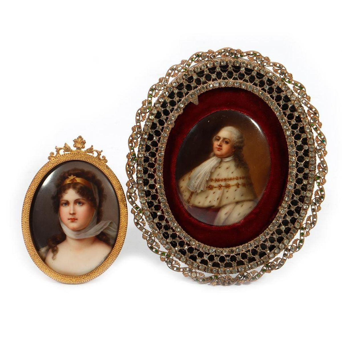 The miniature of the man (with a gold cross hanging from his ermine collar) set in red velvet, in "jeweled" gilt-metal easel frame. Together with a lady with gold headband and scarf, in gilt-metal easel frame. Man: 3 1/2in. x 2 5/8in.; frame 6 3/4in. x 5 1/2in. Woman: 3 1/12in. x 2 1/2in. Both in good condition; the red velvet mount is loose in the frame.