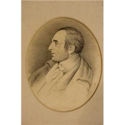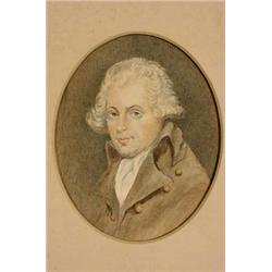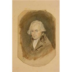 Pair of miniature portraits on paper, Ca. 1820; first is titled "Richard Brinsley Sheriden" after Sir Joshua Reynolds; executed in multi-color watercolor depicting white haired man wearing coat with wide lapels and large buttons; the second is titled "The Late John Tremble Esqre" and is executed in fine pencil and ink; shows a man in profile; both are yellowed with some foxing and tape hinge mounted on paperboard; matted in oval format; unframed; s.s. 5.25" tall x 4.25" wide