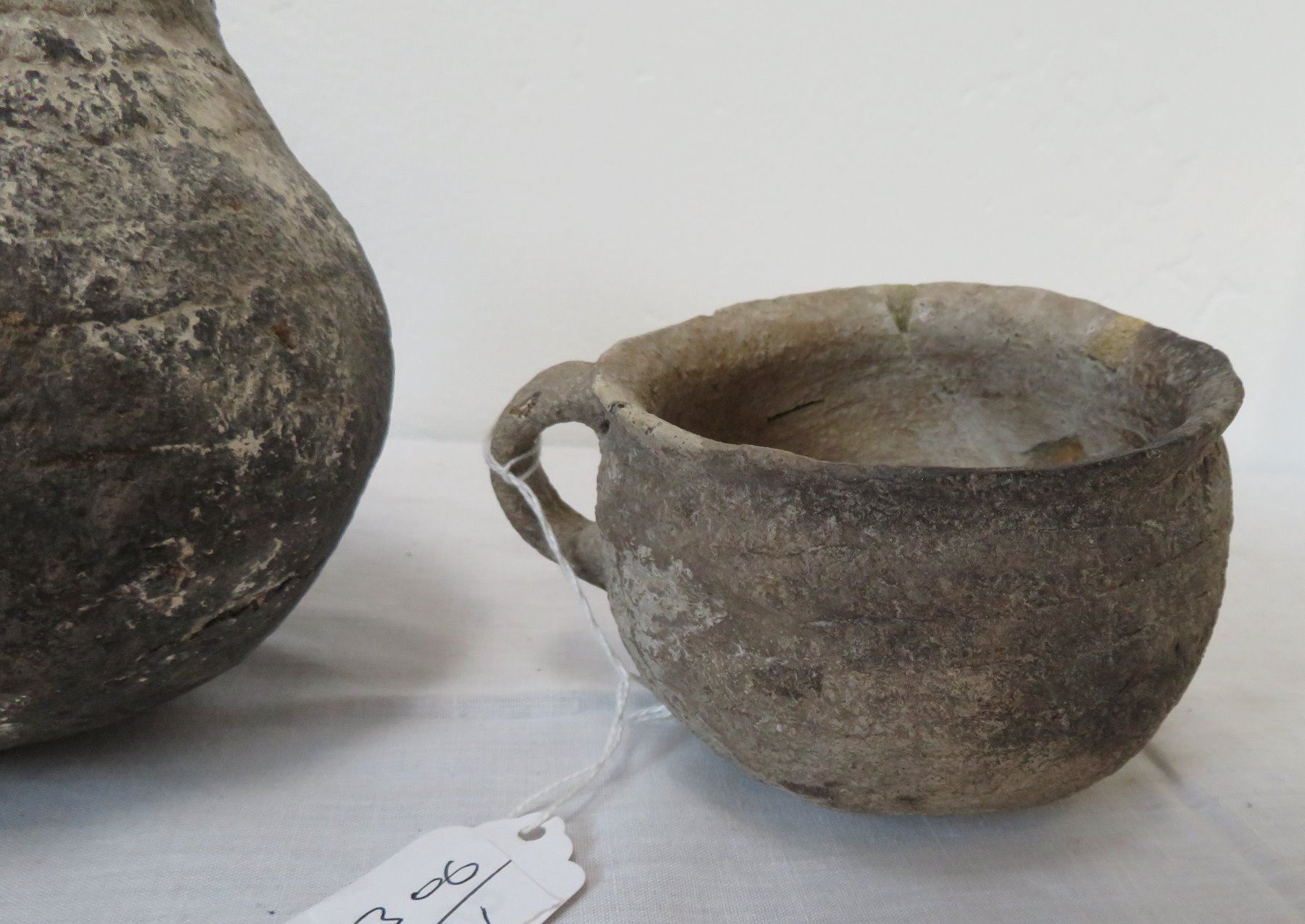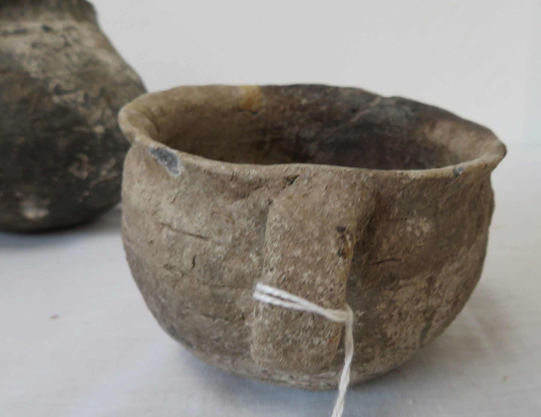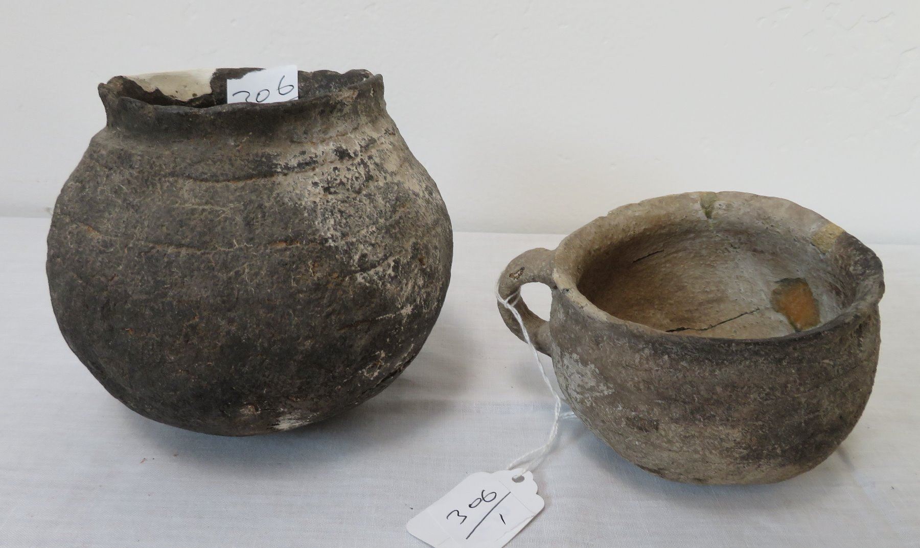 2 Pre-Historic Arizona Pots, c. 2000 years old. Made of clay, the largest item measures 5" x 4". Sacote site, Arizona. Good data on pots. Condition: 2% restoration, see images. Shipping: $30.00 w/insurance and signature, double-boxed, due to value.