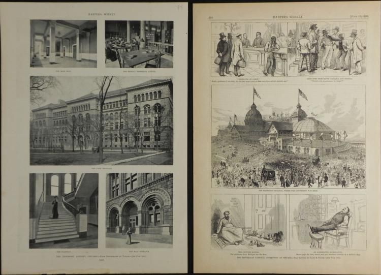 These two antique prints are full of great images, including details of the newly built Newberry Library, and the 1880 Republican National Convention, showing the Exposition Building, plus some cartoons. * * Titles: "Newberry Library;" "Republican National Convention" Medium: Black and white etching on paperPublication: Harper's Weekly Date: 1880'sSheet size: 11 1/2" x 16" * Condition: Very good * These are great early Harper's pages for the Chicago history buff.