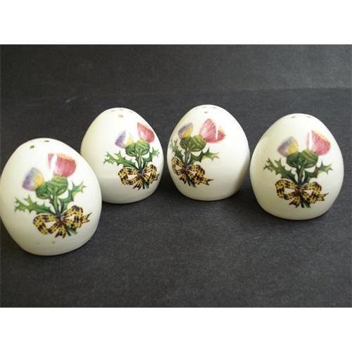 BEAUTIFUL 4 PIECES or TWO SETS OF SALT AND PEPPER SHAKERS,MADE BY SANDFORD, FINE BONE CHINA, MADE IN ENGLAND, DECORATED ON ONE SIDE WITH BEAUTIFUL HEADER AND SCOTTISH TARTAN AND ON THE OTHER SIDE WITH PRETTY SCOTTISH THISTLE AND COLORFUL TARTAN BOW, as per images - Excellent condition, FREE FROM CHIPS OR CRACKS, Each measures about 2 1/4" high - US Buyer to pay 8.00 for shipping plus insurance.THANKS.