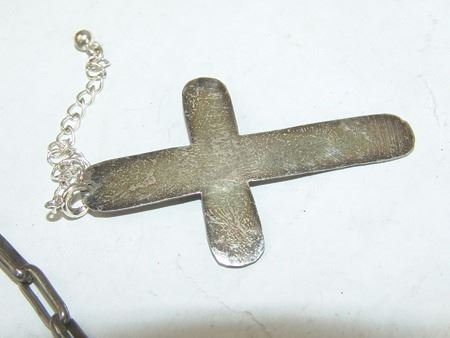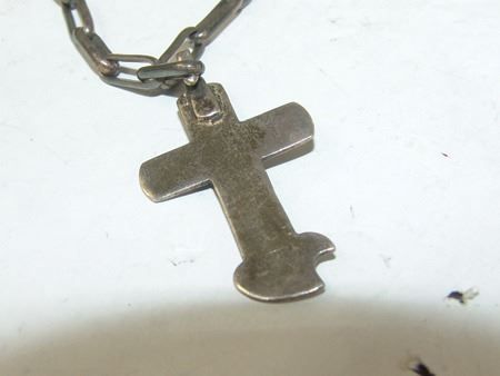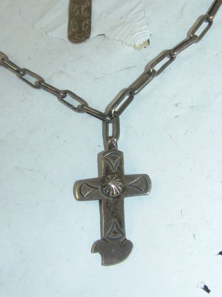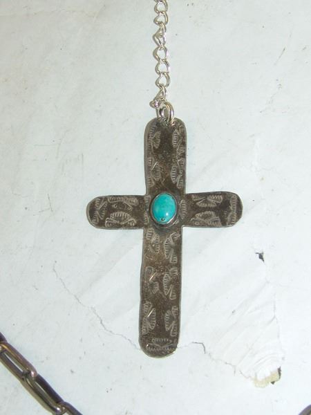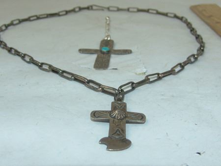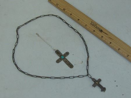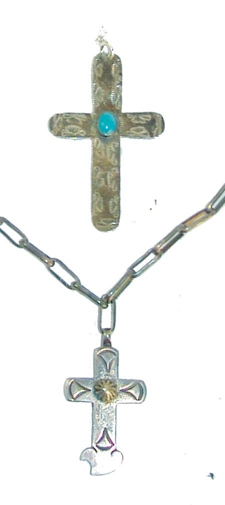 Ca. 1980s, Including a smaller ingot silver cross plus a larger stamped sheet silver cross with turquoise stone. Both in very good condition. 22" long, pendant 1-3/4" x 1"