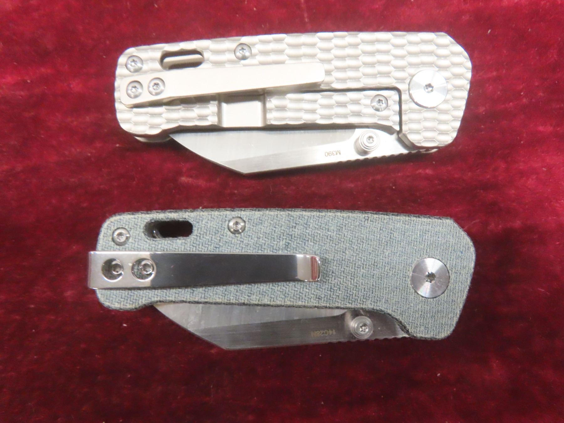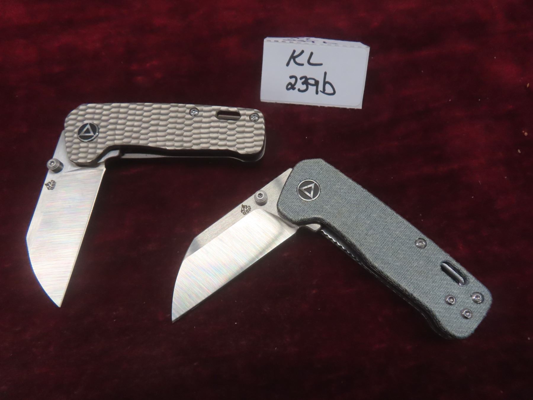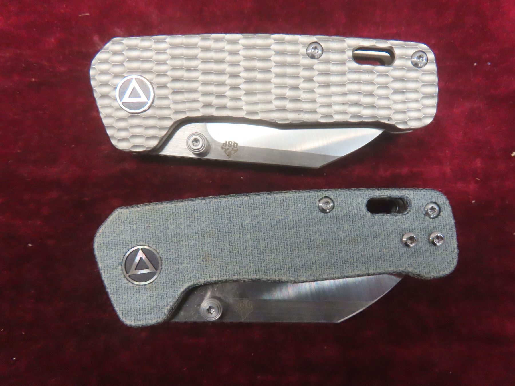 2 QSP Penguin Mini Folding Knives — 2-Tone Satin Sheepsfoot Blades; One With Denim Blue Micarta Handle And One With Grey Jigged Titanium Handle (M390).