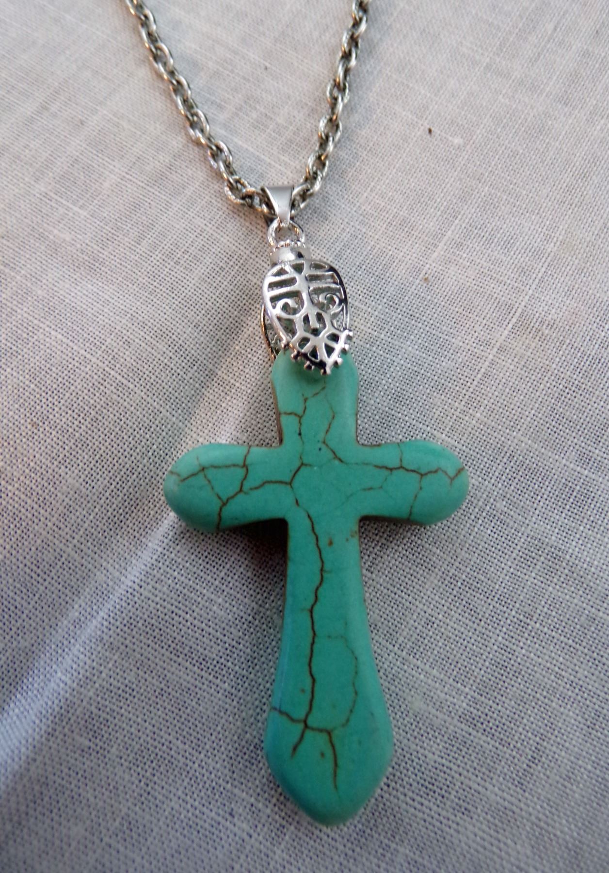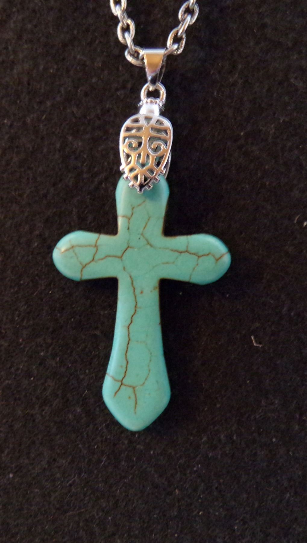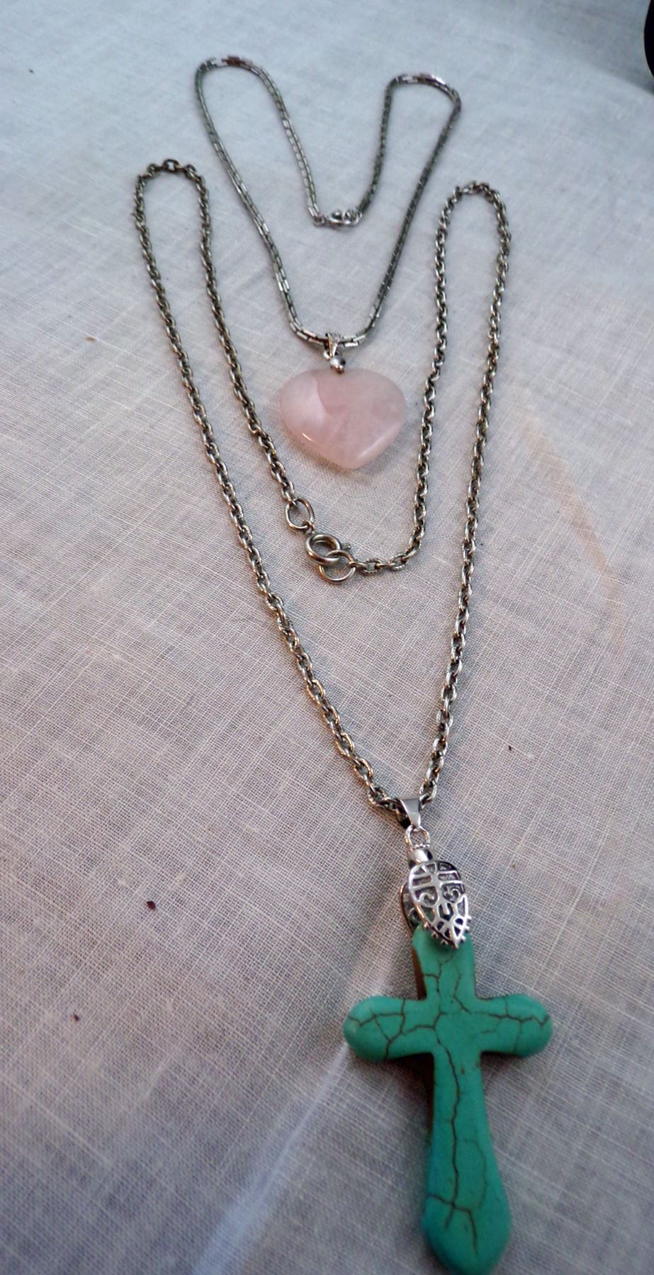 2 Quail Ridge Studios Pendant Necklaces, Turquoise Magnesite Cross Pendant Necklace by Larry McLellan, turquoise magnesite cross with brown matrix, measuring 2.25'' x 1''+ including bale, chain measures 24''L with spring closure, Rose Quartz Heart Pendant Necklace by Larry McLellan, pendant measures 1'' x 1'', not including bale, silver-tone box chain measures 15''L with spring ring closure, The magic of the Desert Southwest is timeless in its display of open landscapes, sunrise and sunset colors with infinite possibilities of artistic expression. The design studio of Quail Ridge was founded on these possibilities, forging an endless variety of earthen gems to their metallic counterparts. The artist, Larry McLellan, designs jewelry contemporary in style, while maintaining elements of native designs.