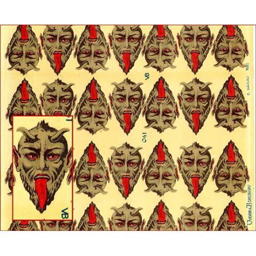 Rare X-MAS paper collectible - (2) large uncut scrap sheet of Grey Devil. There are 42 images on each large (15-1/2" x 10-1/2") sheet, each 2-3/8" high. Marked VB, number 041, dated (6th edition)1939. St. Nicholas Day (December 6th) was very popular Holiday in Europe. On this day small children were visited by trio of St. Nicholas, Devil and Angel. The Devil reminded them that they should listen to their parents and behave well - otherwise he would take them to hell. The Saint Nicholas would then reward the children usually with gingerbread cookies with the St. Nicholas, Devil or Angel scraps pasted on them. Comparable, more common scraps list at $3-4 each. "Devils head" in this condition is very hard to find, full sheet is a RARITY!!! This vintage chromolithograph coated with gummastic based laquer survived its 70 years of age in near MINT condition. Please note that we are picturing only part of the sheet, because it is to large to fit in the scanner. Remeber - you are buying 2 sheets with total of 84 images !!!!