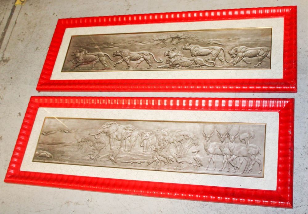 2 RED FRAMED SAFARI STYLE GLASS ENCASED PICTURES