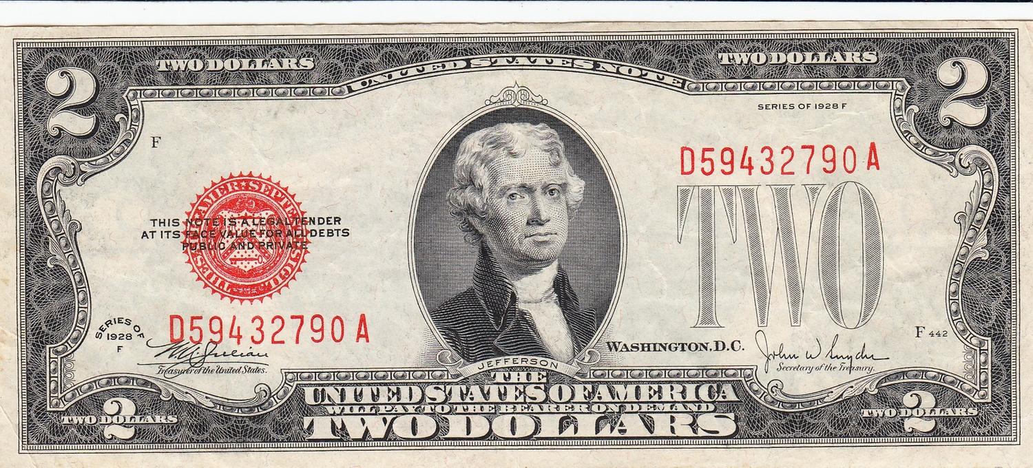 $2 RED SEAL 1928 F SERIES LEGAL TENDER