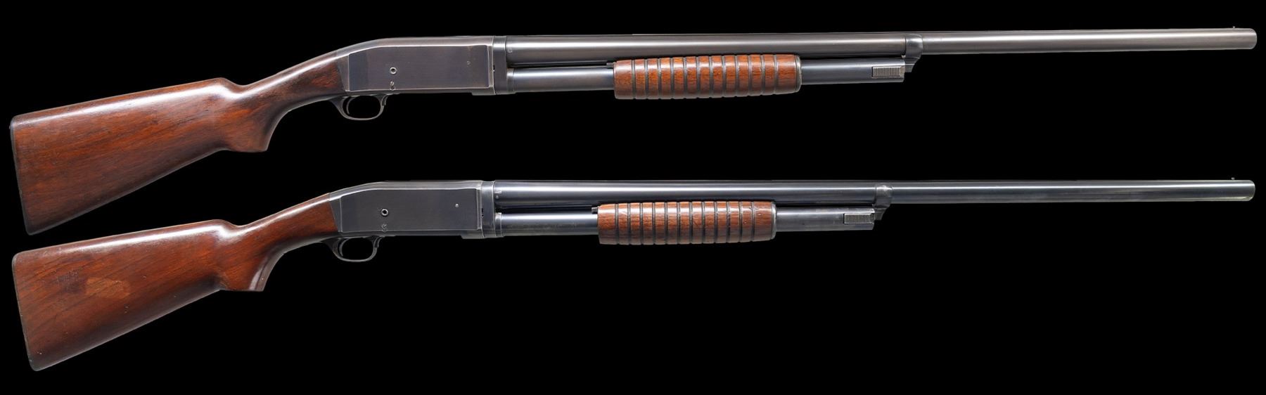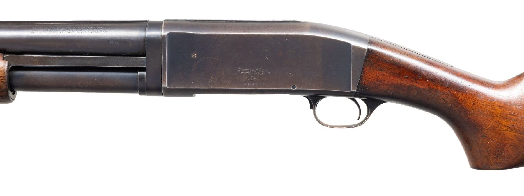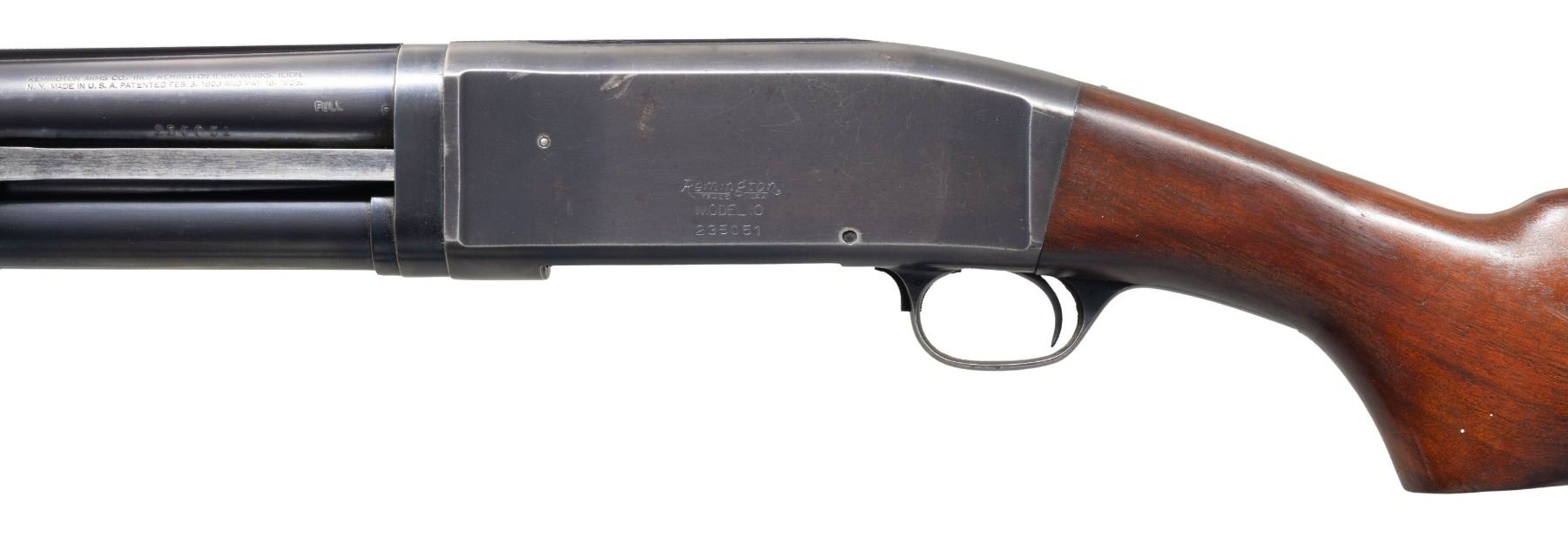 1) Cal. 12 GA. S# 262773. Bbl. 30 1/8". Model 10 pump action shotgun mfg. by Remington. Left side of the bbl. is marked with Remington's mfg. and patent information above a "FULL" choke marking. Left side of the receiver is marked with the Remington trademark logo above "MODEL 10" and the S#. Metal components exhibit a blue finish overall. Grooved wood pump and plain wood pistol grip buttstock with checkered black synthetic Remington UMC buttplate. Solid grooved matte rib with flattened brass bead front sight. CONDITION: metal components retain large amounts of their original factory blue finish, showing areas of wear and thinning that are fading to gray and brown patinas, scattered spots of light surface oxidation, as well as some superficial handling marks overall. Bright bore, exhibiting scattered small patches of mild to moderate pitting. Proper manual mechanics. Wood furniture shows scattered marks, scratches, and small impressions from handling and storage, with the buttstock exhibiting a light crack on the left side of the wrist stemming from the receiver. (25-4441/MLW). CURIO. $400-600. 2) Cal. 12 GA. S# 235051. Bbl. 32 1/8". Model 10 pump action shotgun mfg. by Remington. Left side of the bbl. is marked with Remington's mfg. and patent information above a "FULL" choke marking. Left side of the receiver is marked with the Remington trademark logo above "MODEL 10" and the S#. Metal components exhibit a blue finish overall. Grooved wood pump and plain wood pistol grip stock with Remington UMC checkered brown synthetic buttplate. Solid matte rib with aluminum bead front sight. Matching numbers are present on the receiver and bbl. CONDITION: metal components retain the majority of their original blue finish, showing some spots of light to mild wear and thinning (primarily along edges) and scattered spots of light surface oxidation. Very bright bore. Proper manual mechanics. Wood furniture shows scattered marks, scratches, and impressions from handling and storage, but otherwise remains sound. (25-4496/MLW). CURIO. $400-600.