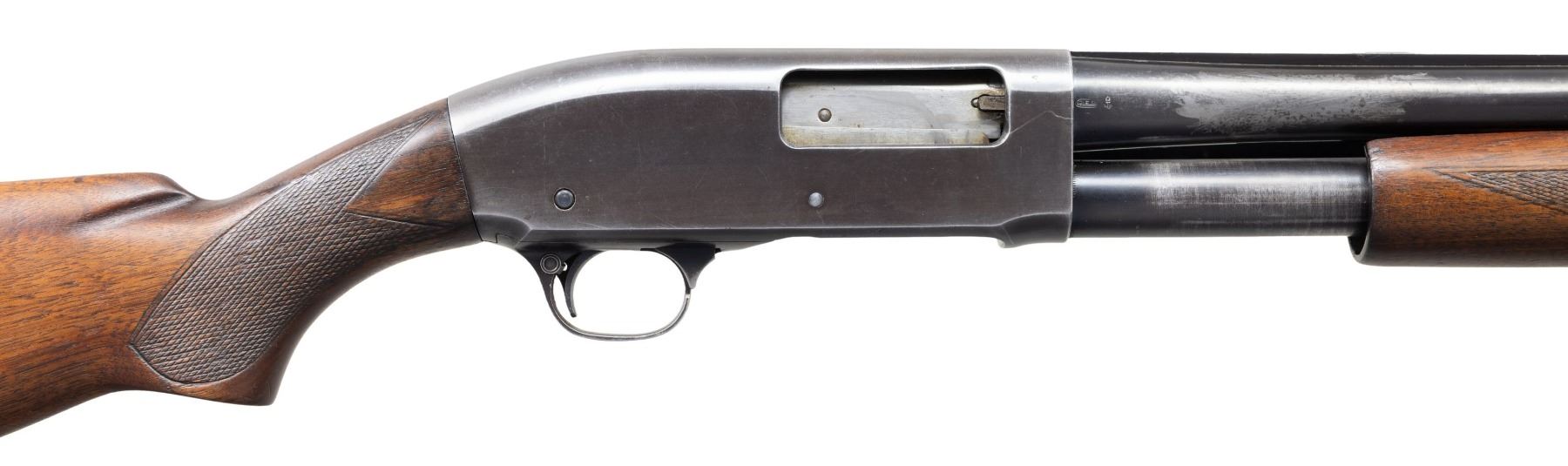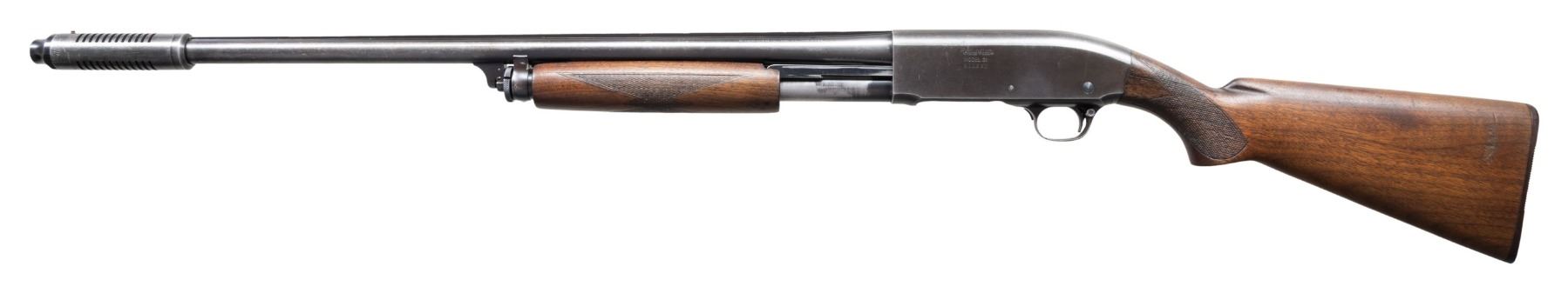 1) Cal. 16 GA. S# 510230. Bbl. 23". Model 31 pump action shotgun mfg. by Remington. Left side of the bbl. is marked with Remington's mfg. and patent information above "16 GA." and "FULL". Left side of the receiver is marked with the Remington trademark logo above "MODEL 31" and the S#. Metal components exhibit a blue finish overall, save for on the bolt, which is polished in-the-white. Checkered wood pump and pistol grip stock with grooved brown Remington hard rubber buttplate. Solid matte rib terminates in a Lyman Cutts compensator with a brass bead front sight. Matching numbers are present on the receiver and bbl. UNATTACHED ACCESSORIES: original 3 slot wood Cutts compensator choke case containing a Mod. and Full choke (unmarked choke currently installed), as well as a "16" marked Cutts choke wrench. CONDITION: metal components retain large amounts of their original factory blue finish, showing areas of wear and thinning fading to gray patina, with scattered superficial handling marks and spots of light pitting present overall. Bright bore, exhibiting a small patch of mild to moderate pitting towards the muzzle. Proper manual mechanics. Wood furniture shows scattered marks, scratches, and small impressions from handling and storage, with the buttstock exhibiting a crack on either side of the wrist that stems from the receiver. Cutts box is good, showing general overall wear, with flaking to its label on the front. (25-4444/MLW). 2) Cal. 12 GA, 2 3/4". S# 36499. Bbl. 30". Model 31 pump action shotgun mfg. by Remington. Left side of the bbl. is marked with Remington's mfg. and patent information above the cal. designation, followed by "FULL". Left side of the receiver is marked with the Remington trademark logo above "MODEL 31" and the S#. Metal components exhibit an aftermarket applied parkerized finish. Grooved wood pump and plain wood pistol grip buttstock with black synthetic spacer and unmarked black rubber recoil pad. Ported bbl. features a matte V/R, as well as an aluminum front and mid bead. UNATTACHED ACCESSORIES: matching 32" aftermarket parkerized bbl. with Full choke and aluminum bead front sight. CONDITION: metal components retain virtually all of their reapplied parkerized finish, showing light to mild pitting beneath the finish. Bright bore, exhibiting some light pitting and scratches. Proper manual mechanics. Wood furniture shows some superficial marks and impressions, but otherwise remains sound. Matching bbl. retains virtually all of its parkerized finish, showing light to mild pitting beneath the finish. Very bright bore, with some pinprick pitting. (25-4488/MLW). ALL CURIO. $800-1,200.
