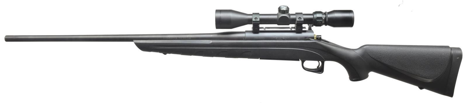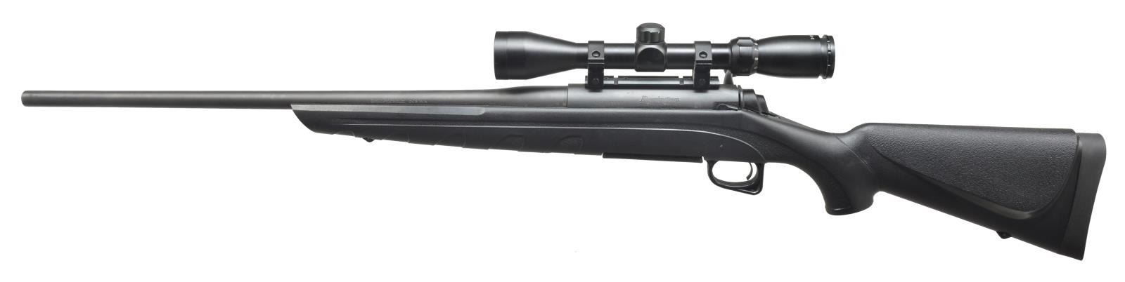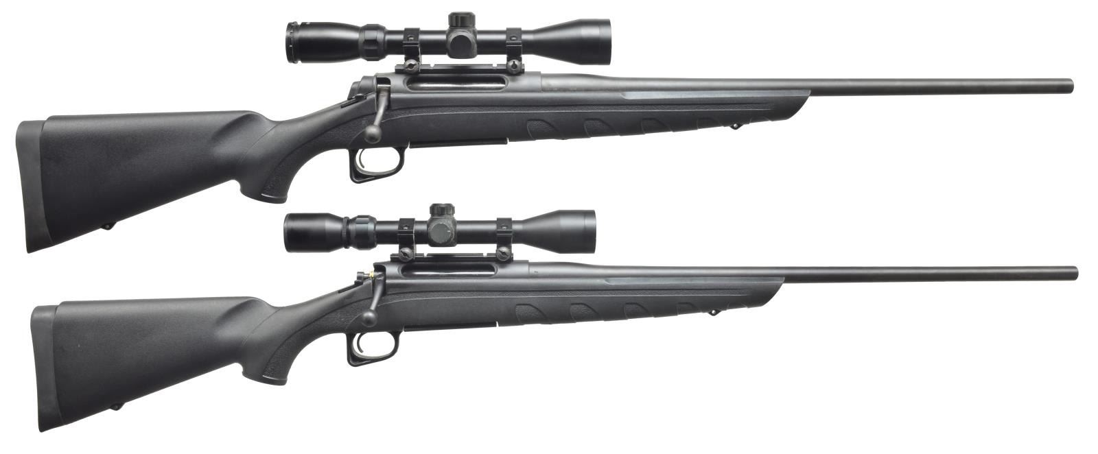 1) Cal. 308 Win. S# M71985488. Bbl. 22 1/2” made w/ out sights. Receiver has Weaver base & rings holding an unmarked 3-9 scope w/ duplex reticle. Black synthetic stock w/ stippled grip & black grip cap w/ a lg. “R”. Solid black Remington recoil pad. Left side cheek piece. Sling swivel attachments. CONDITION: bbl. retains most original matte blue w/ minor scratching at muzzle. Receiver retains most of its original matte finish. Synthetic stock has original finish. Bore has scattered fine pitting. (20-3426/BT). 2) Cal. 7 mm Rem Mag. S# 71538994. Bbl. 24” made w/ out sights. Receiver has Weaver scope base & rings holding a Bushnell 3-9 w/ duplex reticle. Black synthetic stock w/ stippled pistol grip & lg. “R” marked black grip cap. Solid black recoil pad w/ Remington cheekpiece. Sling swivel attachments. MAGS: 1 Remington marked mag. CONDITION: bbl. retains most of its original matte finish w/ few handling marks & a minor scratch near muzzle. Receiver retains most of its original matte finish. Stock retains its black original finish. Bore is good. (20-3427/BT). BOTH MODERN. $600-900.