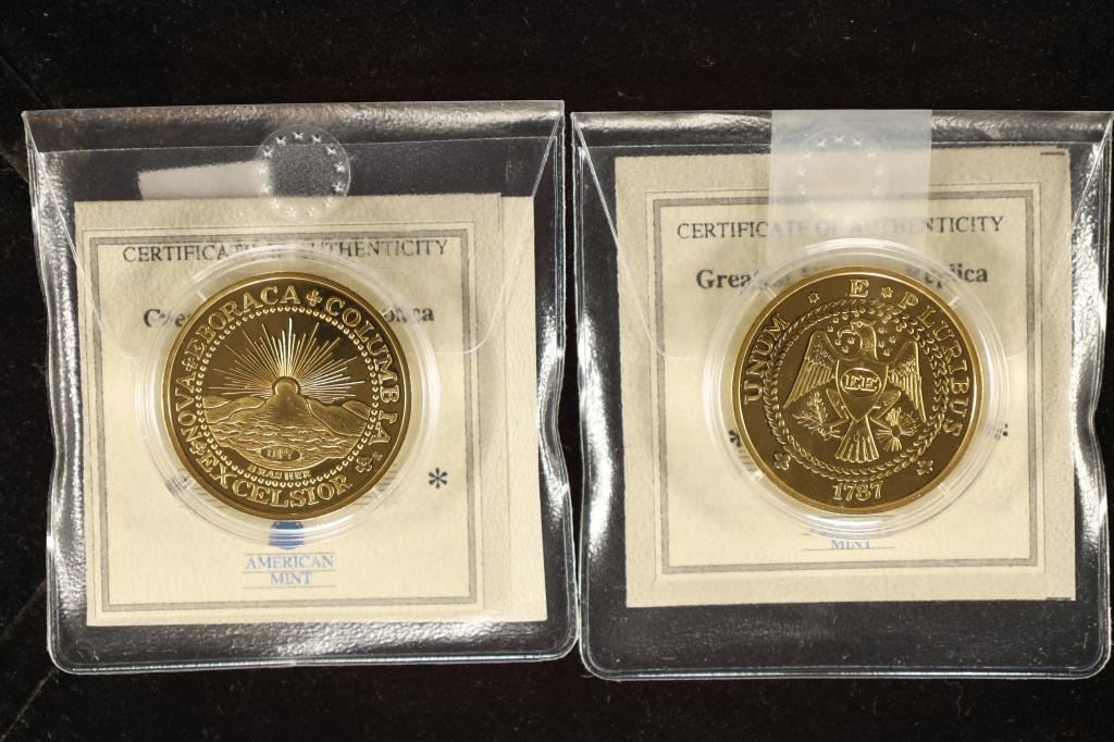 BOTH ARE GOLD PLATED, IN HARD PLASTIC CAPSULE WITH CERT. FROM THE AMERICAN MINT