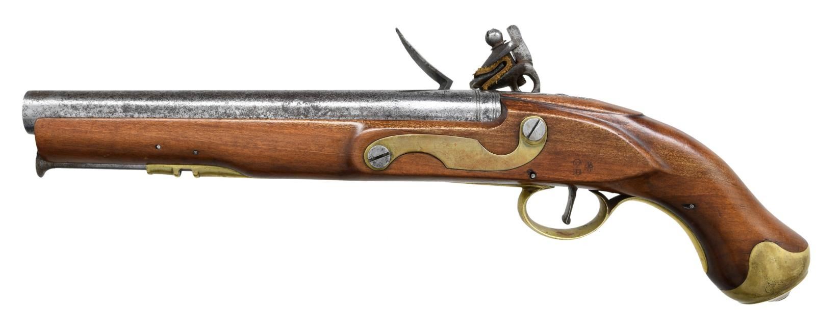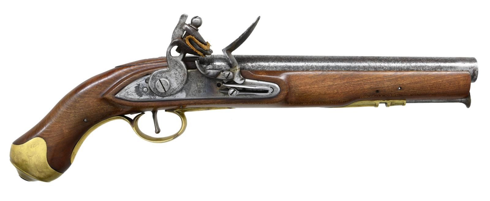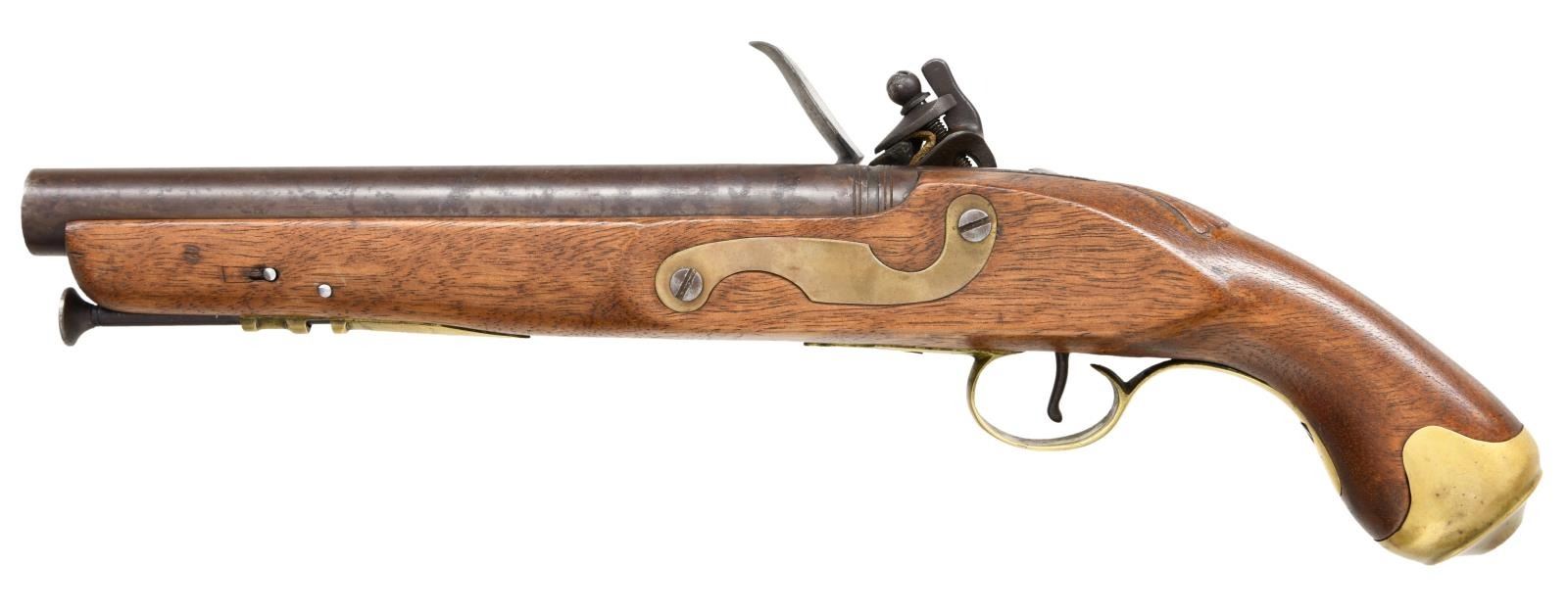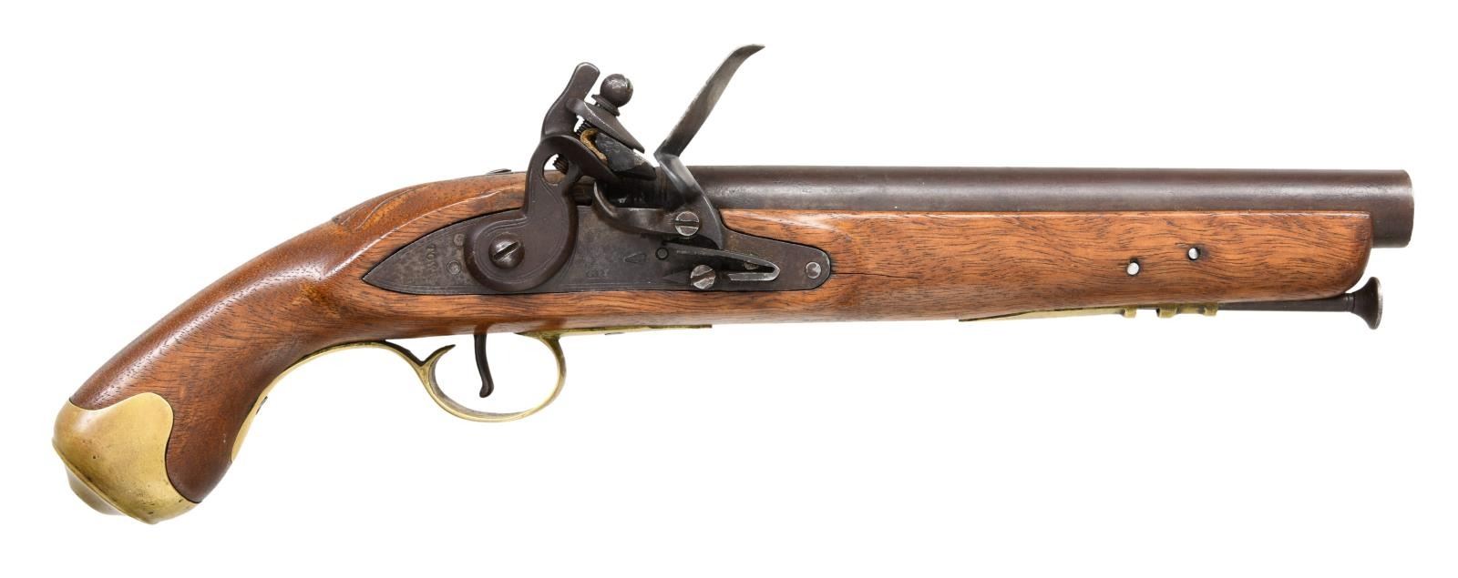 1) Cal. 70. NSN. Bbl. 9" smoothbore. Lock has Tower marking at rear & "Crown/GR" marking in middle. No other maker's marks or proofs present. Brass furniture. Balance of metal is gray. Ramrod present. Hardwood stock. CONDITION: stock has a few grain crack & handling wear. Brass parts show scattered oxidation & dings. Balance of metal is a dull gray patina w/ scattered oxidation. Bore shows scattered oxidation. (01-23604/MJC). 2) Cal. 70. NSN. Bbl. 9". Top of bbl. has British proofs, Broad Arrow & "EW" inspector's marking. Lock Has British crown/"GR" & "TOWER" markings. No other visible markings on metal. Brass trigger guard, thimble & grip cap. Hardwood stock w/ "GR" marking on left flat. Ramrod present. CONDITION: stock shows light handling wear. Brass parts remain partially bright w/ scattered oxidation. Balance of metal is a dull gray patina w/ scattered oxidation & light pitting. Oxidized bore. (01-23656/MJC). ALL ANTIQUE. $200-400.