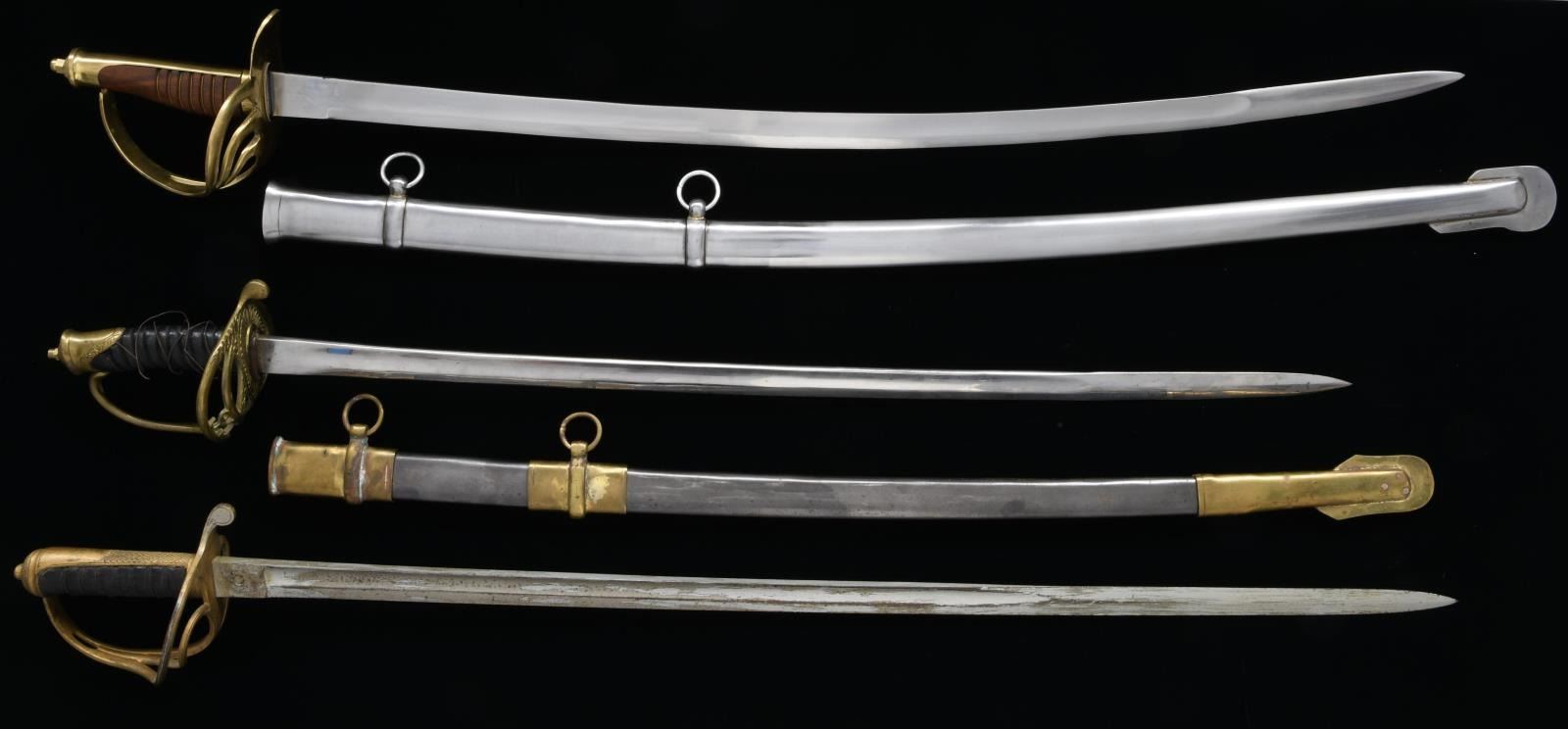 1) REPRODUCTION CAVALRY SABER. Overall length: 42 1/2". Blade length: 33 1/2". Plain blade marked "INDIA" at the ricasso. Brass semi-basket hilt with wire-wrapped wood grip. Iron/steel scabbard. CONDITION: storage wear only. 2) REPRODUCTION CONFEDERATE SABER. Overall length: 39 1/2". Blade length: 30 1/2". Plain blade with a single medium fuller. Gilded brass hilt with "CS" in the semi-basket guard. Wire-wrapped leather grip. Gilded brass mounted iron/steel scabbard. CONDITION: blade has original factory polish. Hilt is solid. Grip is complete, but wire is dislodged. Scabbard shows light wear overall with a few areas of verdigris. 3) BRITISH. Overall length: 40 3/4". Blade length 35". Plain blade with a single medium fuller. The ricasso is marked "GORDON MITCHELL & CO LONDON" in a circle. Gold washed iron hilt with wire-wrapped faux sharkskin grip. No scabbard. CONDITION: blade appears to have been painted silver at one time, and the hilt appears to have been painted gold. Grip & wire are complete. (02-19611-1/BF). $200-300.