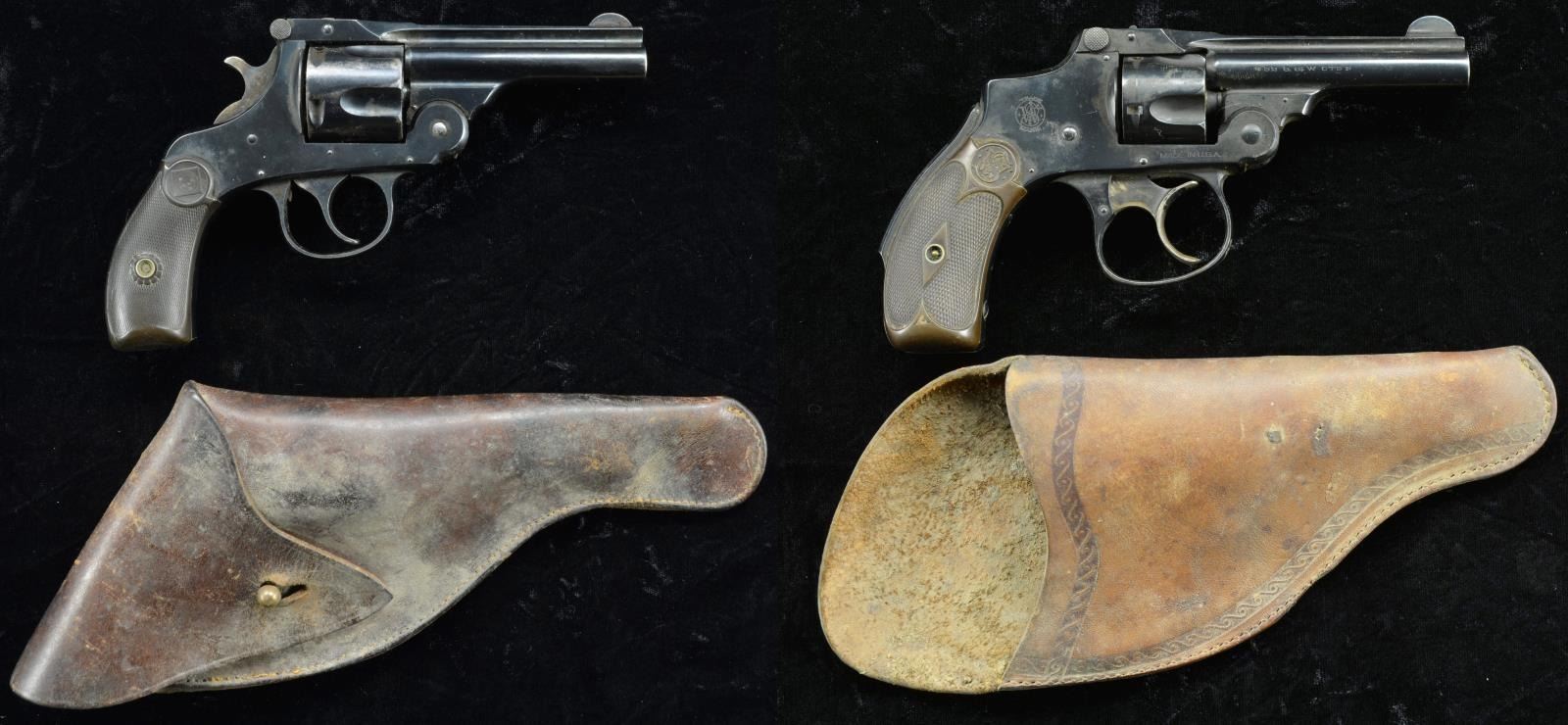 2) SMITH & WESSON 3RD MODEL 32 SAFETY HAMMERLESS REVOLVER. Cal. 32 S&W. S# 228233. Bbl. 3". Mfg. 1909-1937. Unique & desirable double action only revolver w/ a 5 shot fluted cyl. Blued finish. Front sight is a rnd. blade forged into the bbl. while the rear sight is a notched raised portion on the bbl. latch. While these are typically encountered w/ monogrammed & checkered black rubber grips, these have a more distinctive golden brown color. Checkered grip safety. UNATTACHED ACCESSORIES: an unmarked brown leather holster. CONDITION: exposed metal surfaces retain complete & consistent coverage w/ only gentle thinning around muzzle typically caused by repetitive holstering. Extremely light drag line on cyl. potentially illustrating very little use. Rubber grips appear free of any noticeable blemishing. Bore is bright w/ sharp rifling. (22-1214/JZ). ALL CURIO. $100-200.