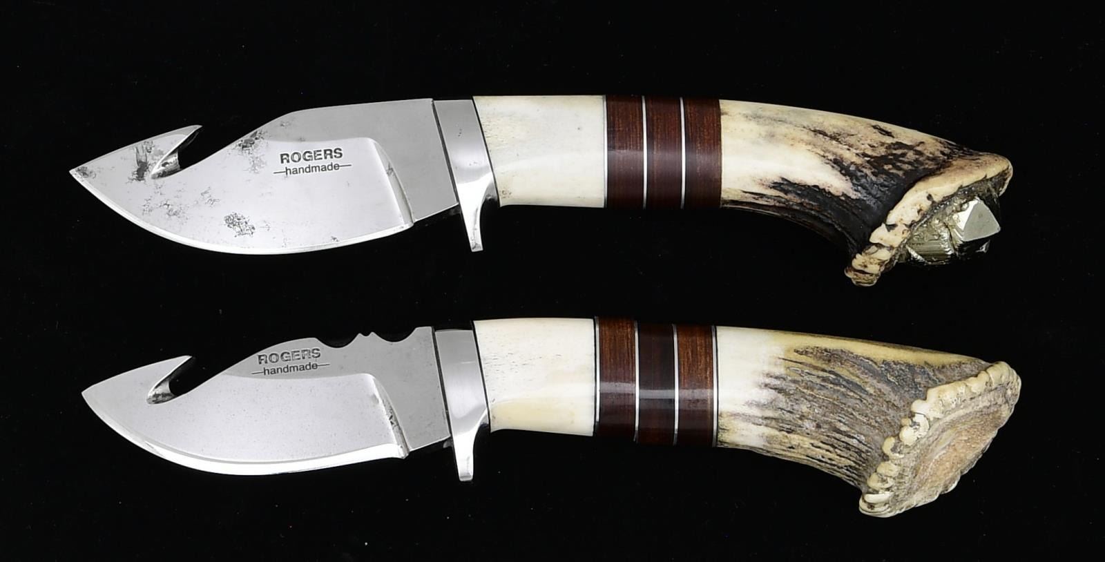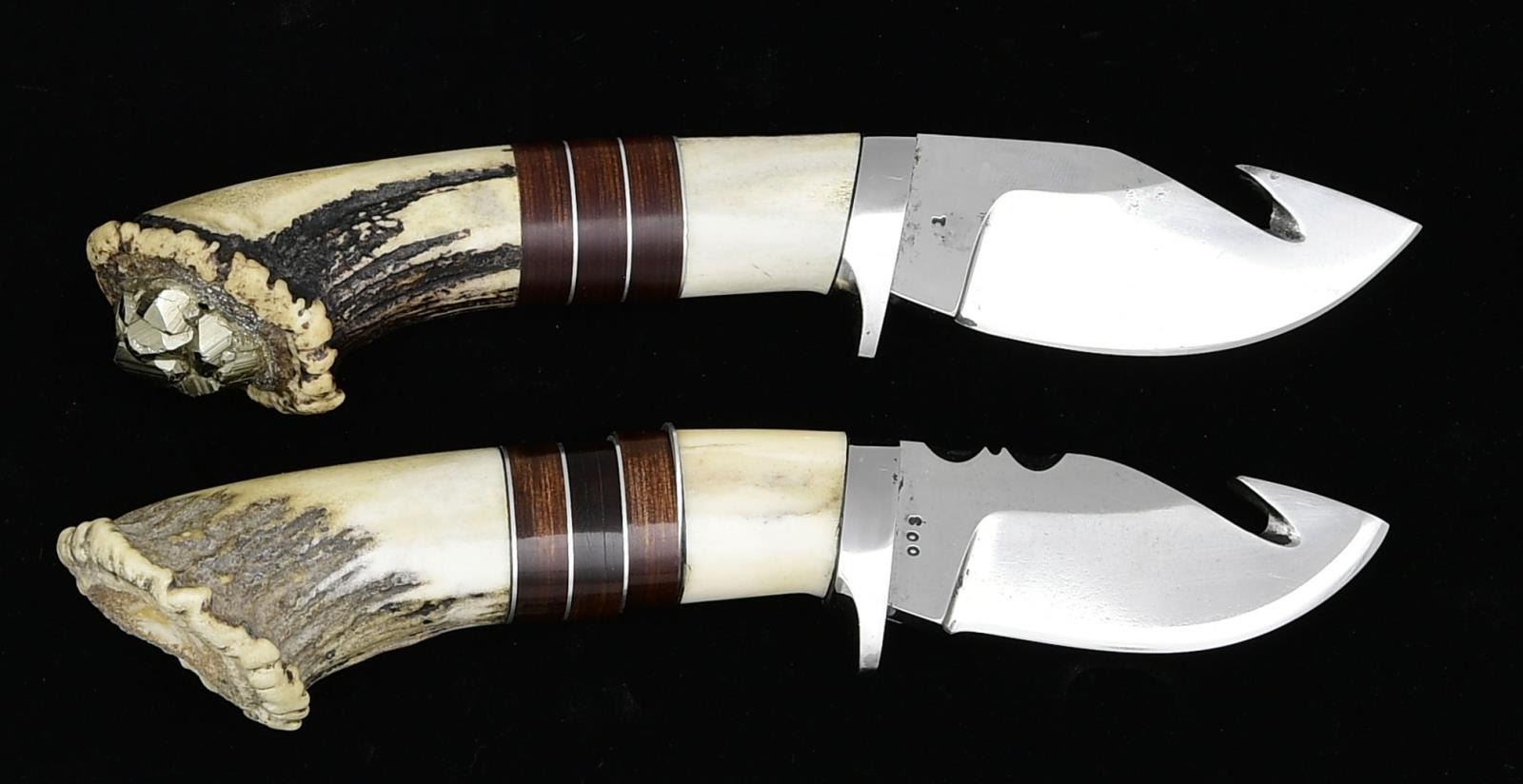 Both approx. 9 1/4" overall. Blades: 3 1/4" overall w/ gut hook. Nickel single hilt. Stag handles w/ hardwood & bright washers. 1) S# 1. Butt of stag handle has gold colored stone formation. CONDITION: blade has spots of cleaned pitting w/ very good handle. 2) S# 003. Blade has 1 1/4" sculpted spine. CONDITION: blade has evidence of sharpening w/ spots of patina. Washers are loose in handle. PROVENANCE: From the personal collection of Brad Shepherd. (02-19842-3/MD). $300-500.