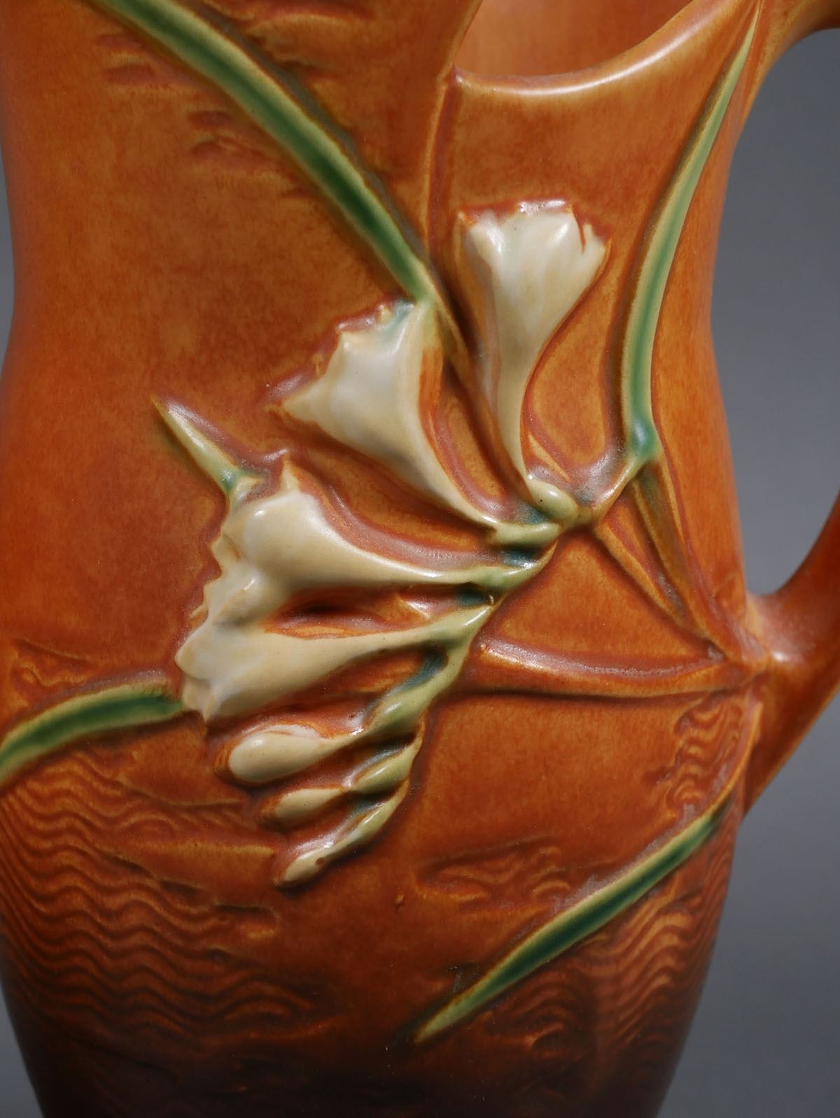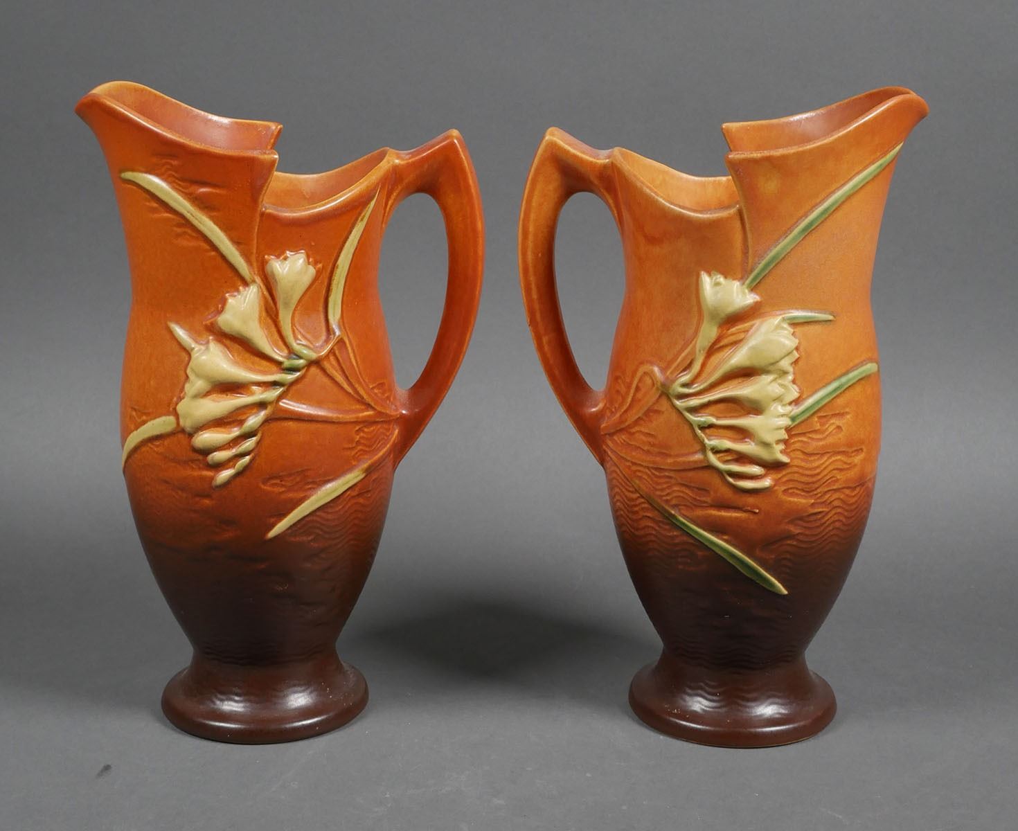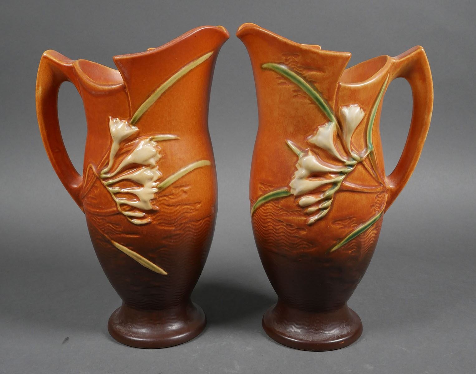 Pair Roseville Freesia art pottery pitchers. Marked on the bottoms "Roseville USA 20-10". Each measure 10 1/2" tall x 6 1/2" from spout to handle. Excellent condition, no cracks, chips or repairs.
