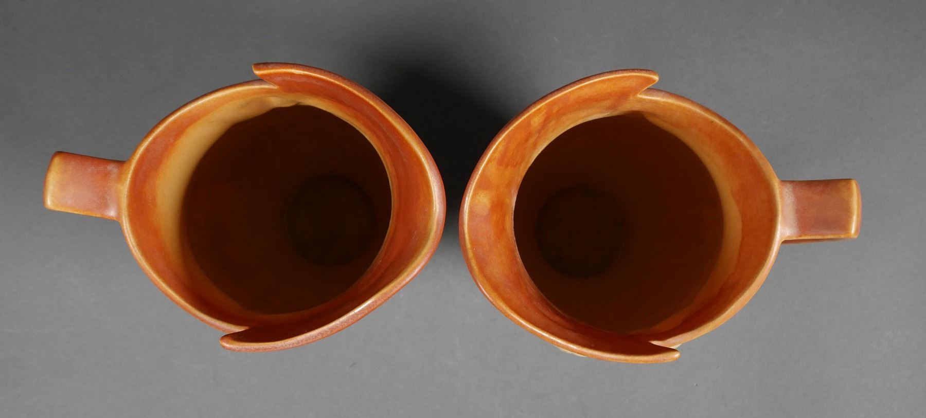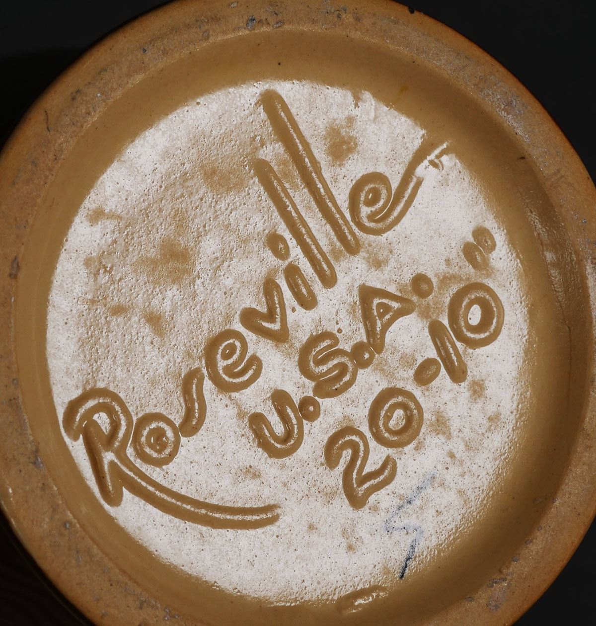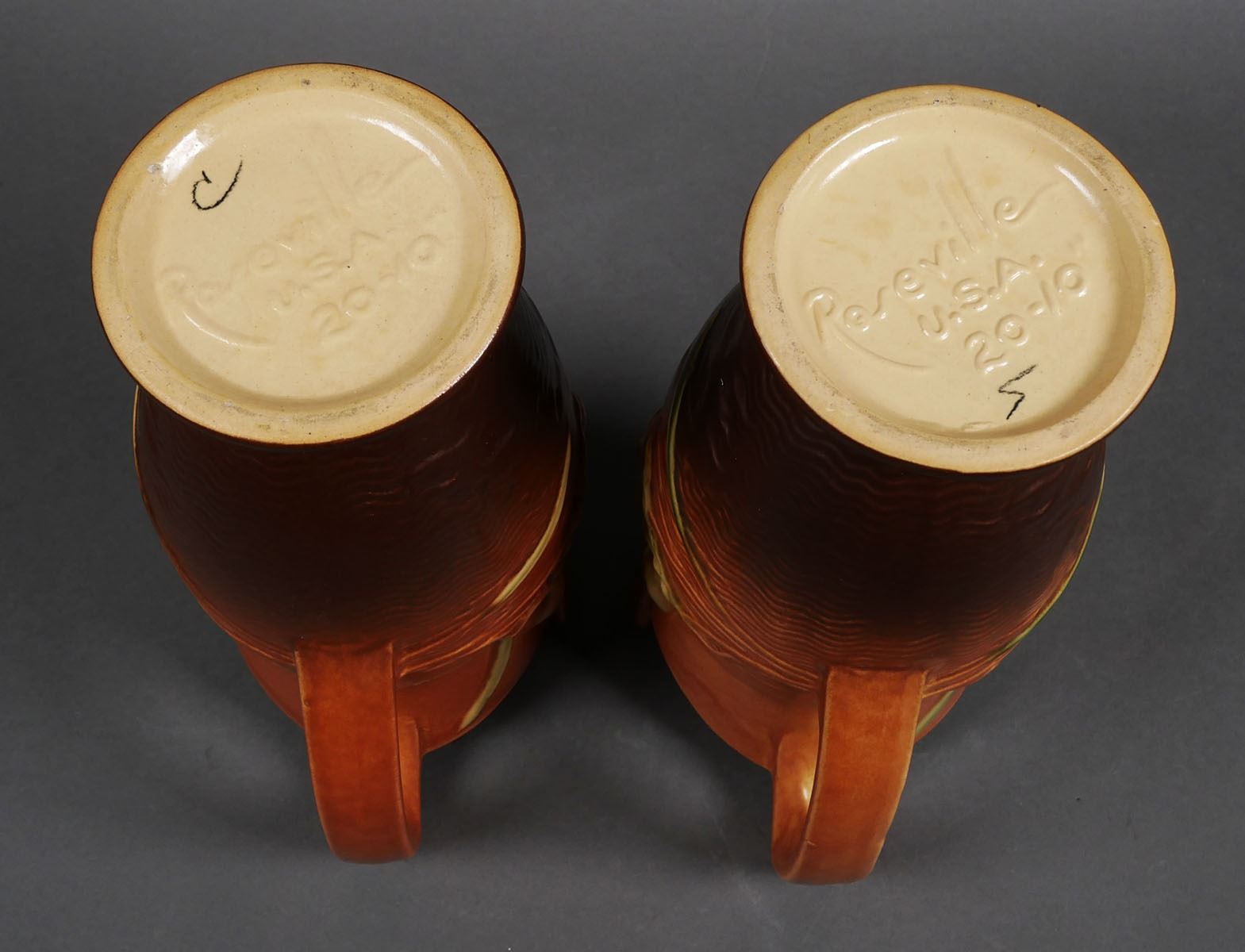 Pair Roseville Freesia art pottery pitchers. Marked on the bottoms "Roseville USA 20-10". Each measure 10 1/2" tall x 6 1/2" from spout to handle. Excellent condition, no cracks, chips or repairs.