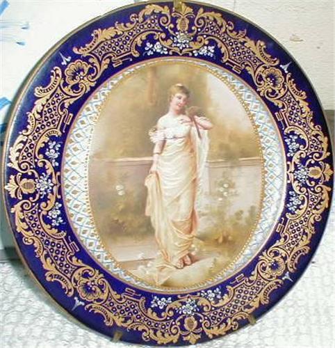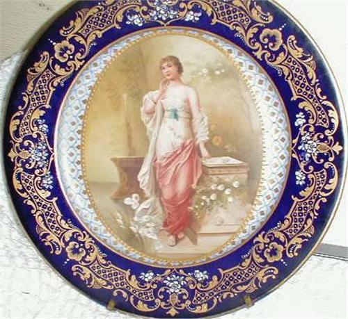 (2) ROYAL VIENNA LATE VICTORIAN PERIOD HND. PTD. PLATES W/GLD OVERLAY, (1) ARTIST SIGNED C.HERR SUBJECT EIN KUSSECHEN, DEEP COBALT BLUE BACKGROUND, MINT CONDITION