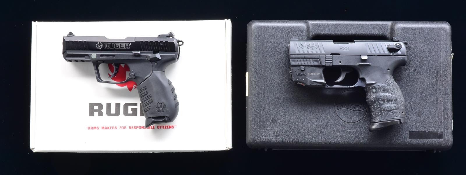 BOTH: cal. 22 LR. 1) SR22. S# 364-19985. Bbl. 3 1/2”. Blued finish. Adjustable three dot sight. Ambidextrous safety & mag release. MAGS: 4-10 rd. UNATTACHED ACCESSORIES: matching numbered white box w/ accessories. CONDITION: overall near excellent w/ only a couple of very minor handling marks. Mags are difficult to seat. Near excellent bore w/ good rifling. (20-3739/ZAL) 2) P22 w/ LASER SIGHT. S# Z109427. Bbl. 3 1/2”. Blued finish. 3 dot fixed sights. Ambidextrous safety & mag release. Walther laser. MAGS: 2-10 rd. UNATTACHED ACCESSORIES: original box. CONDITION: overall near excellent w/ only minor handling marks. Near excellent bore w/ distinct rifling. (20-3881/ZAL). BOTH MODERN. $400-600.
