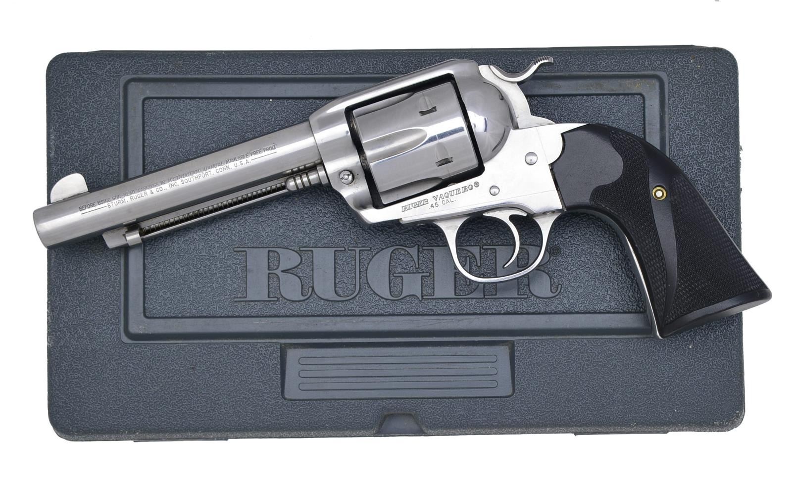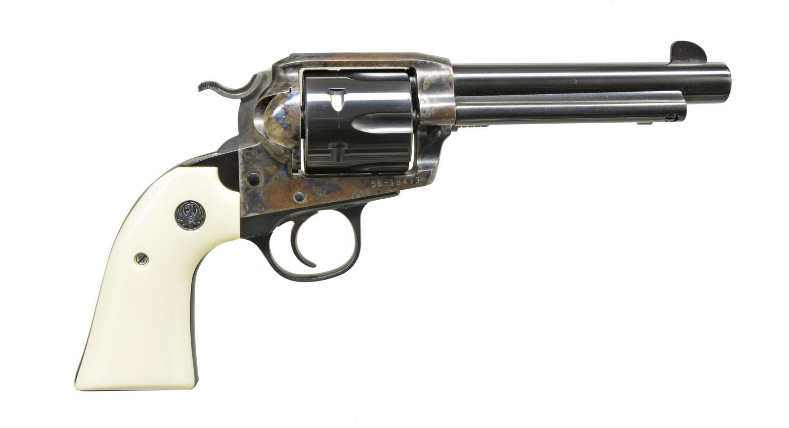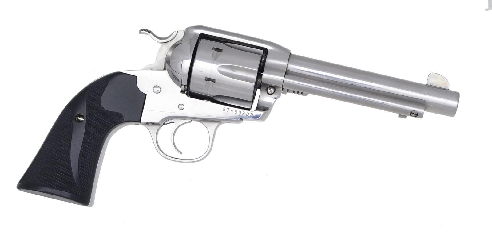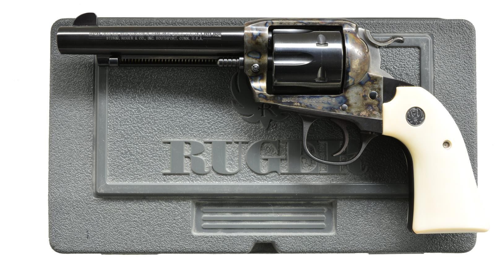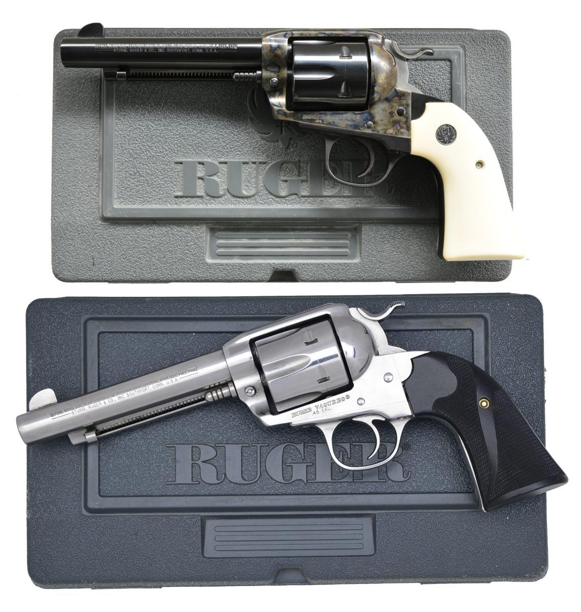 1) Cal. 44 Mag. S# 58-18493. Bbl. 5 1/2" w/ blade front sight & frame notched rear. Mfg. 2002 as RBNV475 indicating Bisley model w/ case colored frame. Simulated ivory grips w/ silver eagle medallions. UNATTCHED ACCESSORIES: matching numbered factory gray plastic box w/ packaging. CONDITION: very faint cyl. turn line & traces of cleaned light oxidation on case colored frame. Retains overall very good to near excellent appearance. Near excellent bore & grips. (20-2528/NW). 2) Cal. 45 LC. S# 57-89802. Bbl. 5 1/2" w/ blade front sight & frame notched rear. Mfg. 2001 as KRBNV455 indicating polished stainless Bisley model. Aftermarket border checkered black synthetic grips w/ out medallions. Lighter hammer spring giving target like trigger pull. UNATTCHED ACCESSORIES: factory gray plastic case numbered to another like revolver w/ different bbl. length. CONDITION: very faint cyl. turn line & traces of light firing residue. Near excellent overall appearance including bore & grips. (20-2533/NW). BOTH MODERN. $800-1,200.