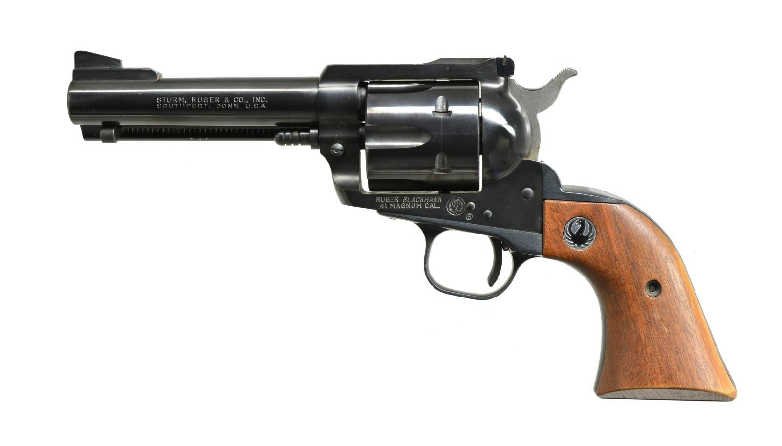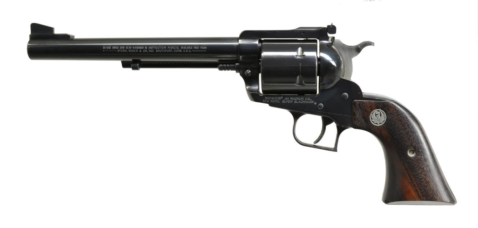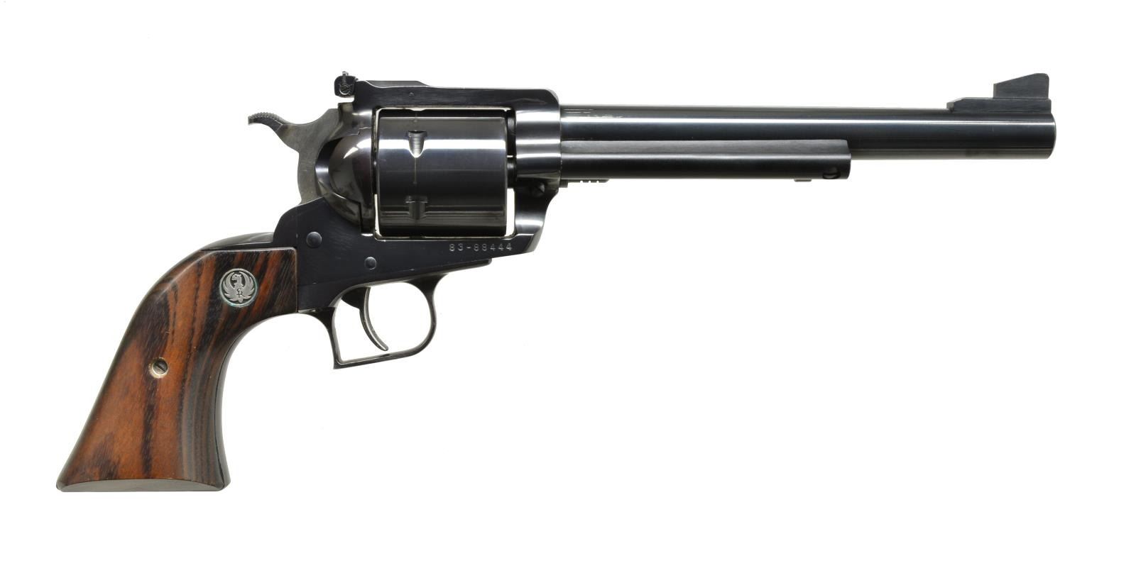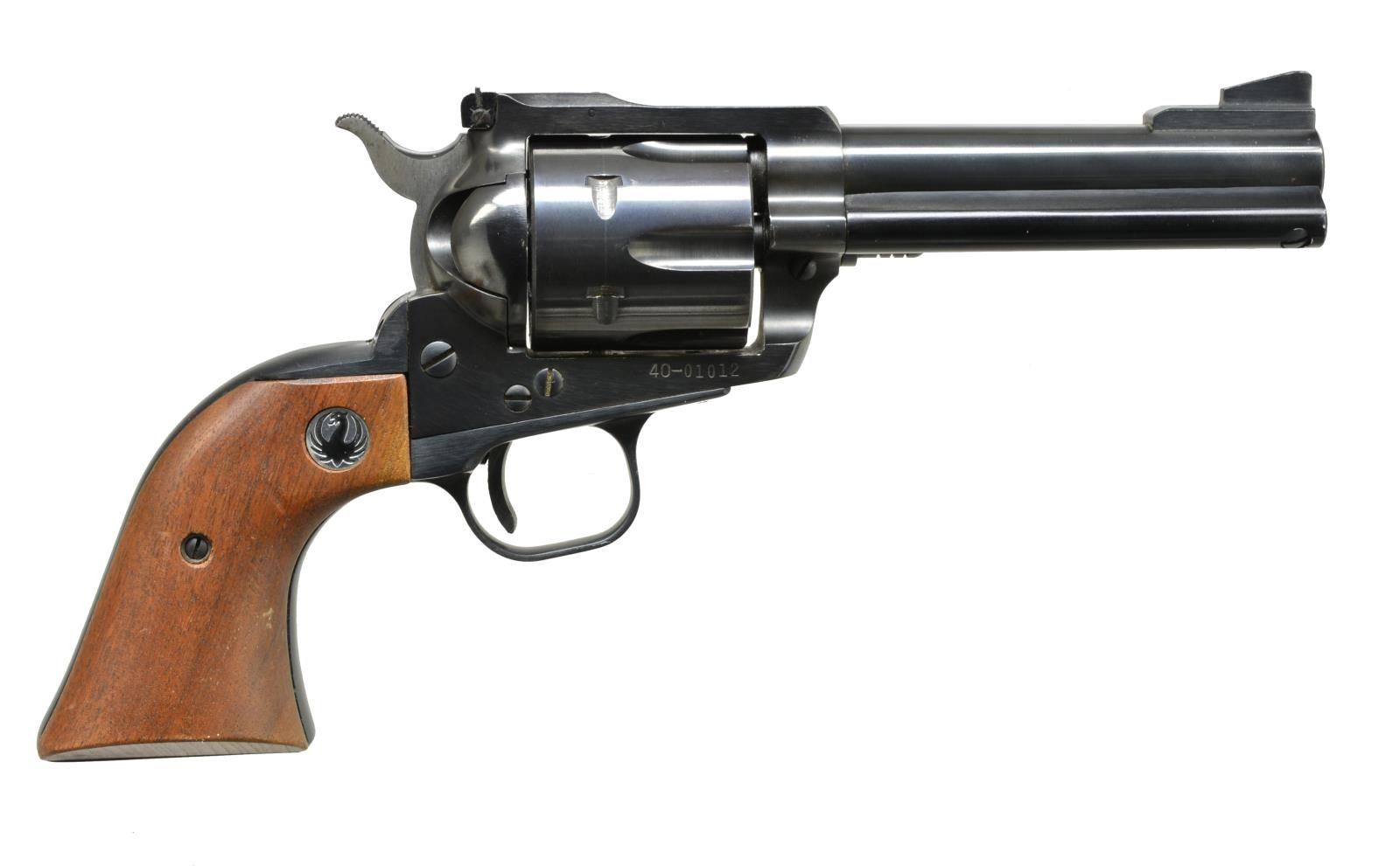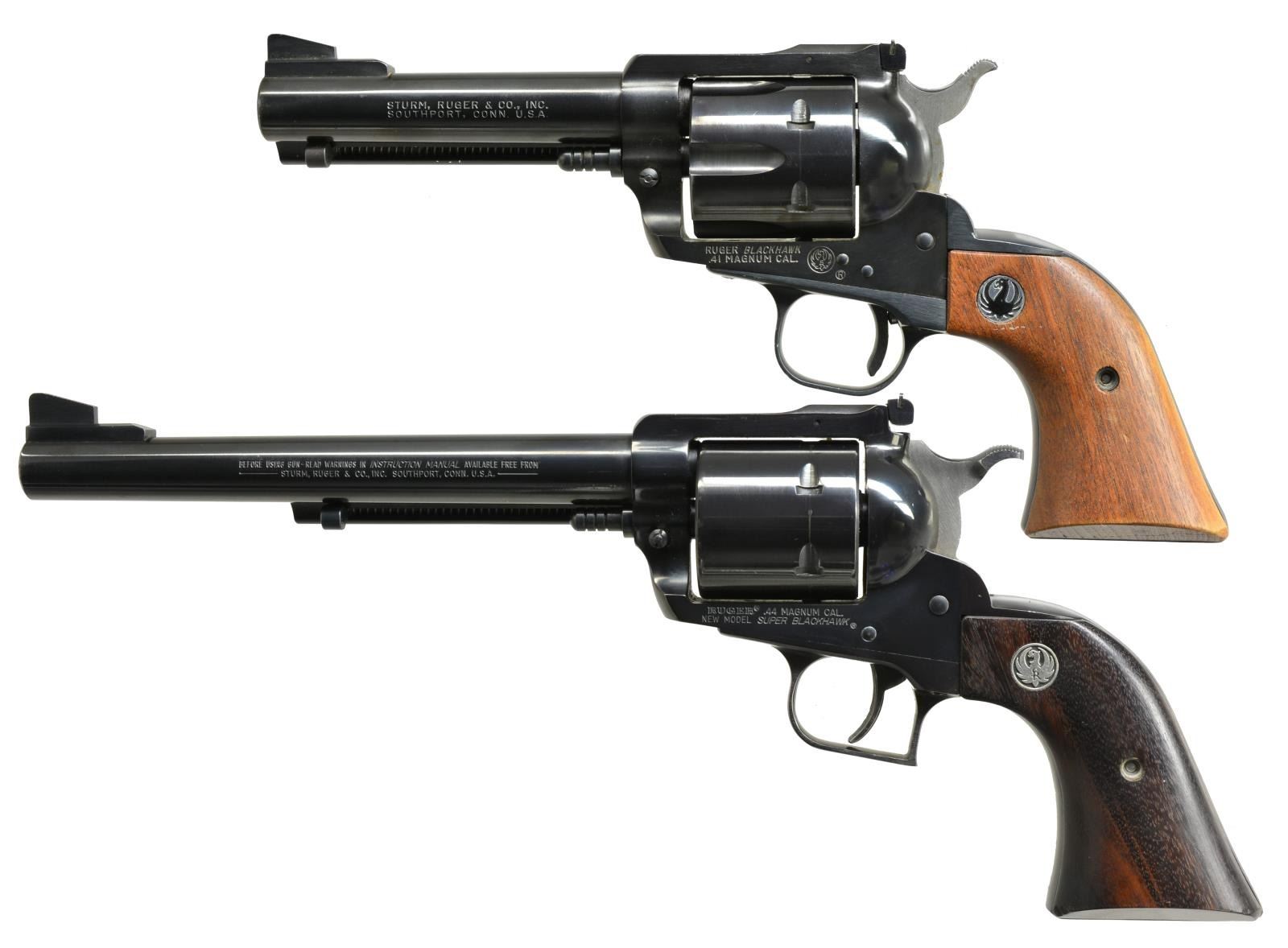 1) OLD MODEL RUGER BLACKHAWK. Cal. 41 Mag. S# 40-01012. Bbl. 4 3/4". Ramp front w/ blade sight & adj. rear sight. Uncheckered Ruger walnut grips w/ Black Eagle emblem. CONDITION: blue is very good, original w/ some minor muzzle wear & faint turn ring on cyl. Grips have excellent original finish. Bore is very good. (20-3862/BT). 2) RUGER NEW MODEL SUPER BLACKHAWK. Cal. 44 Mag. S# 83-88444. Bbl. 7 1/2". Ramp w/ blade sight front & adj. rear sight. Unfluted cyl. Uncheckered Ruger walnut grips w/ silver Ruger emblem. UNATTACHED ACCESSORIES: non matching Ruger Blackhawk box w. matching numbered Super Blackhawk shipping sleeve. CONDITION: gun retains most of its original blue w/ minor muzzle wear & faint turn ring on cyl. Grips have very good original finish, left grip has sm. chip on bottom front. Bore is very good. (20-3864/BT). BOTH MODERN. $1,500-2,200.
