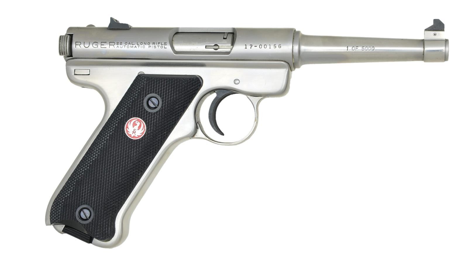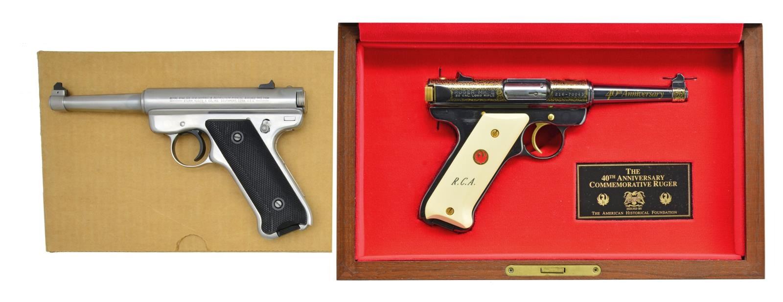 PISTOLS. BOTH: cal. 22 LR. Bbls. 4 3/4". 1) 1 OF 5000 SIGNATURE MODEL. S# 17-00156. Mfg. 1982 to commemorate original model before starting MKII series. Created in stainless that would be offered for MKII but in early style w/out hold open latch. Left side of receiver near top has Bill Ruger's signature & right side of bbl. has stamped "1 of 5,000". Checkered black plastic grips having red background silver eagle medallion. Black sights & trigger. Early style packaging of salt cod style wood box (black eagle on lid) having red hinged cardboard box inside along w/ manual & likeness of original $37.50 brochure. MAGS: 1 factory stainless w/ black base in style of chrome plated base of originals. UNATTACHED ACCESSORIES: shipping sleeve w/ above mentioned wood box, etc. CONDITION: all aspects near excellent; appears new. (21-1273/NW). 2) 40th ANNIVERSARY MODEL. S# 216-70043. Approx. 950 Mfg. 1991 as American Historical Foundation commemorative. Original retail of $995 plus additional $149 for presentation case. Extensive gold leaf plus gold plated sm. parts to include rear of bolt & trigger. High polished blue w/ simulated ivory grips having gold neck feather eagle medallions (one red, one black); R.C.A. in black on right grip. Left side of frame forward of trigger pivot marked "40TH731". MAGS: 1 factory 10 rd. w/ silver eagle medallion base. UNATTACHED ACCESSORIES: AHF glass topped walnut display case w/ commemorative plaque, certificate of authenticity & red velvet cut out interior plus case key. CONDITION: all aspects near excellent appearing new. (21-1281/NW). BOTH MODERN. $800-1,200.