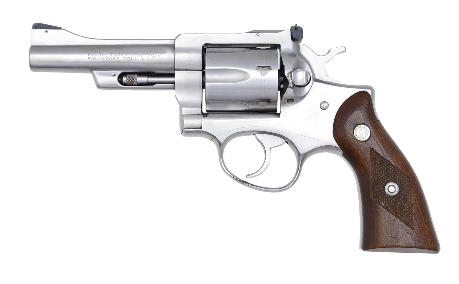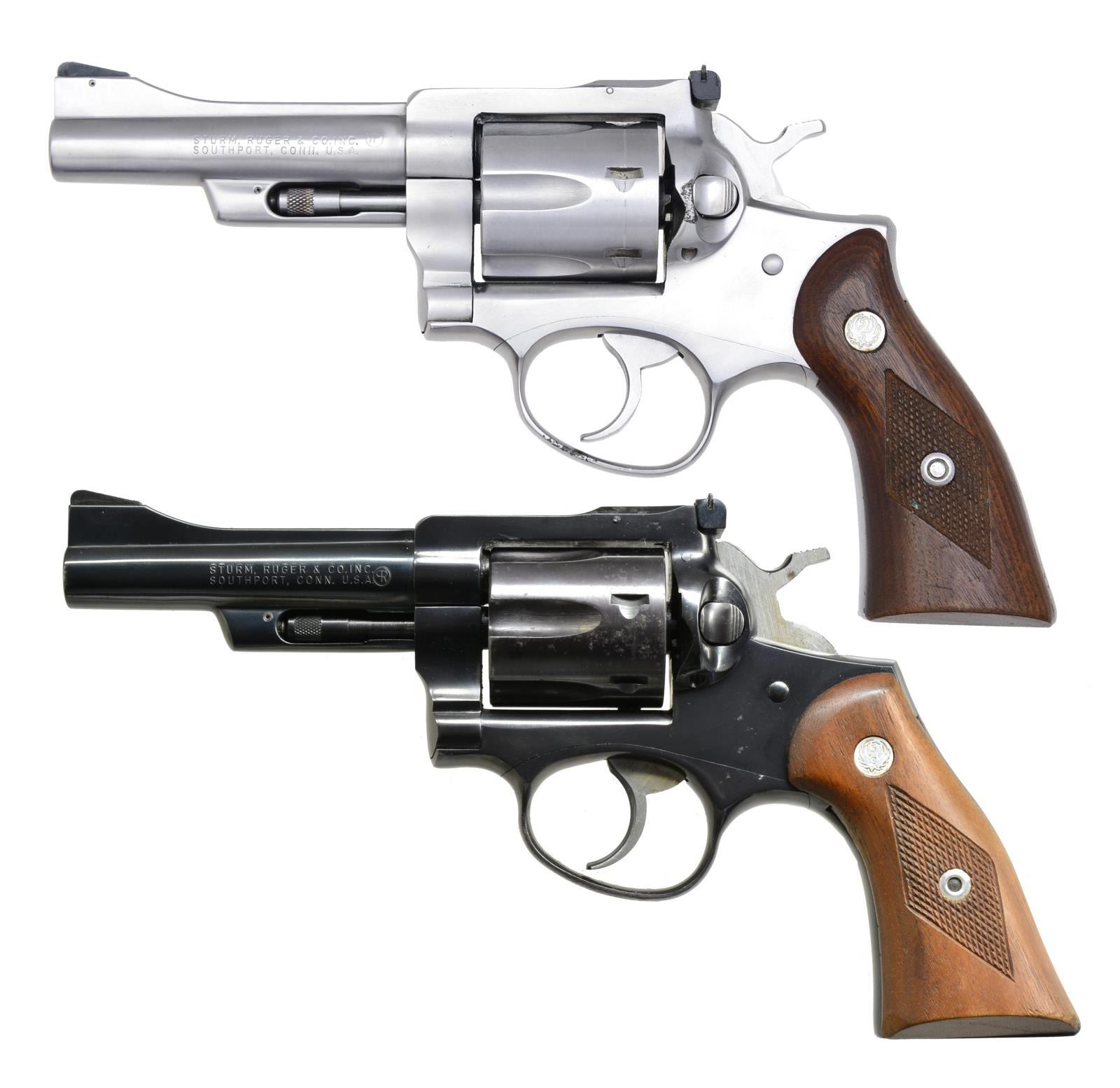 1) BLUED 4" STAINLESS STEEL SECURITY SIX. Cal. 357 Mag. S# 151-43400. Bbl. 4" stainless steel bbl. w/ serrated rib & pin blade front sight. Adj. rear sight. Checkered Ruger walnut grips. 6 Shot cyl. UNATTACHED ACCESSORIES: red & black Ruger box Cat. No. RDA-34 w/ papers. Box marked w/ non matching pen written number. CONDITION: original stainless finish w/ minor turn ring on cyl. Grips have original finish w/ good checkering. Bore is very good. (20-3646/BT). 2) BLUED 4" SECURITY SIX. Cal. 357 Mag. S# 150-37276. Bbl. 4" serrated solid rib bbl. Pin blade front sight & adj. rear sight. 6 Shot cyl. Checkered Ruger walnut grips. CONDITION: gun retains most of its original blue w/ some minor muzzle wear. Grips have very good original finish w/ good checkering. Bore is bright. (20-3650/BT). BOTH MODERN. $500-800.